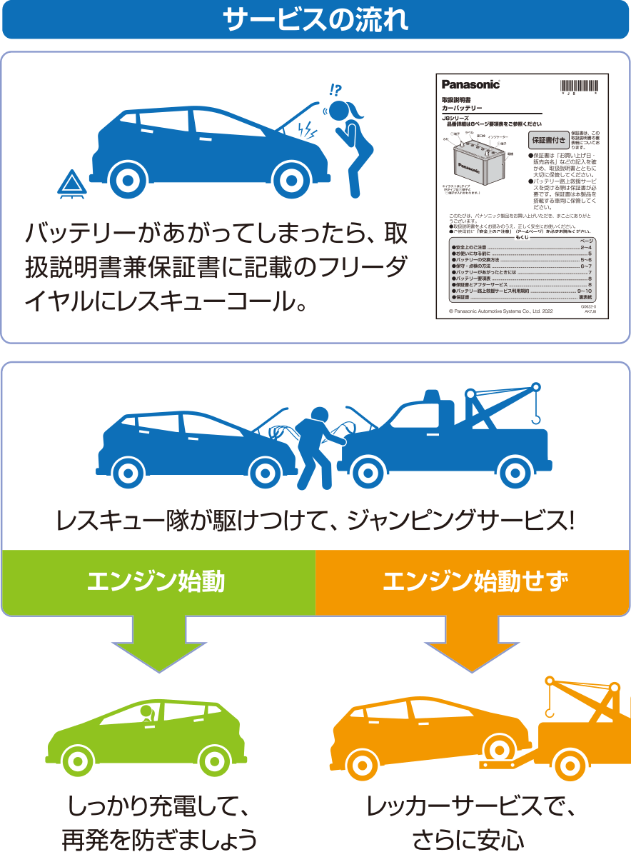 バッテリーにあまり詳しくない方や、遠出が多くて出先でのトラブルが心配、、、という方にオススメです。