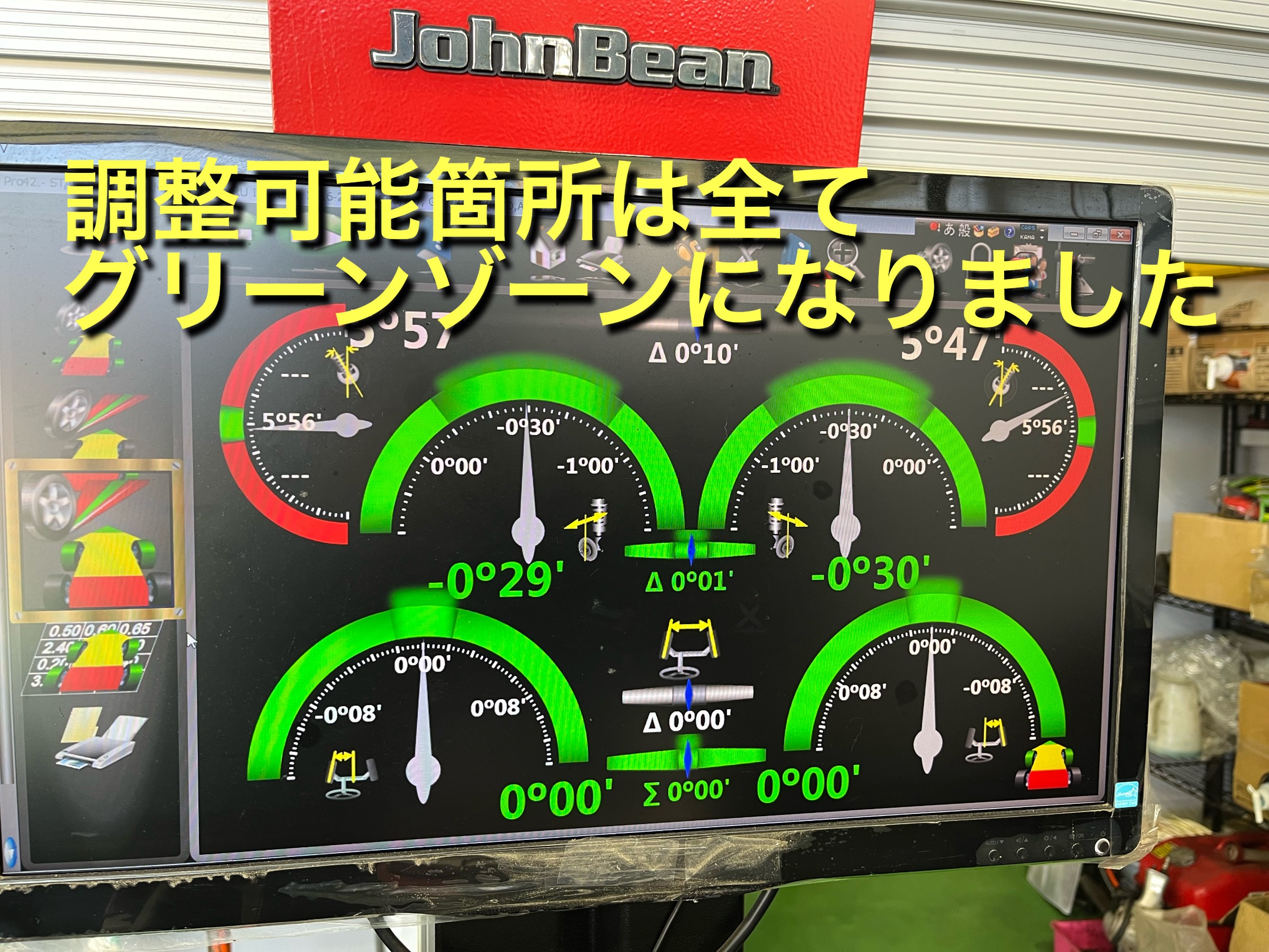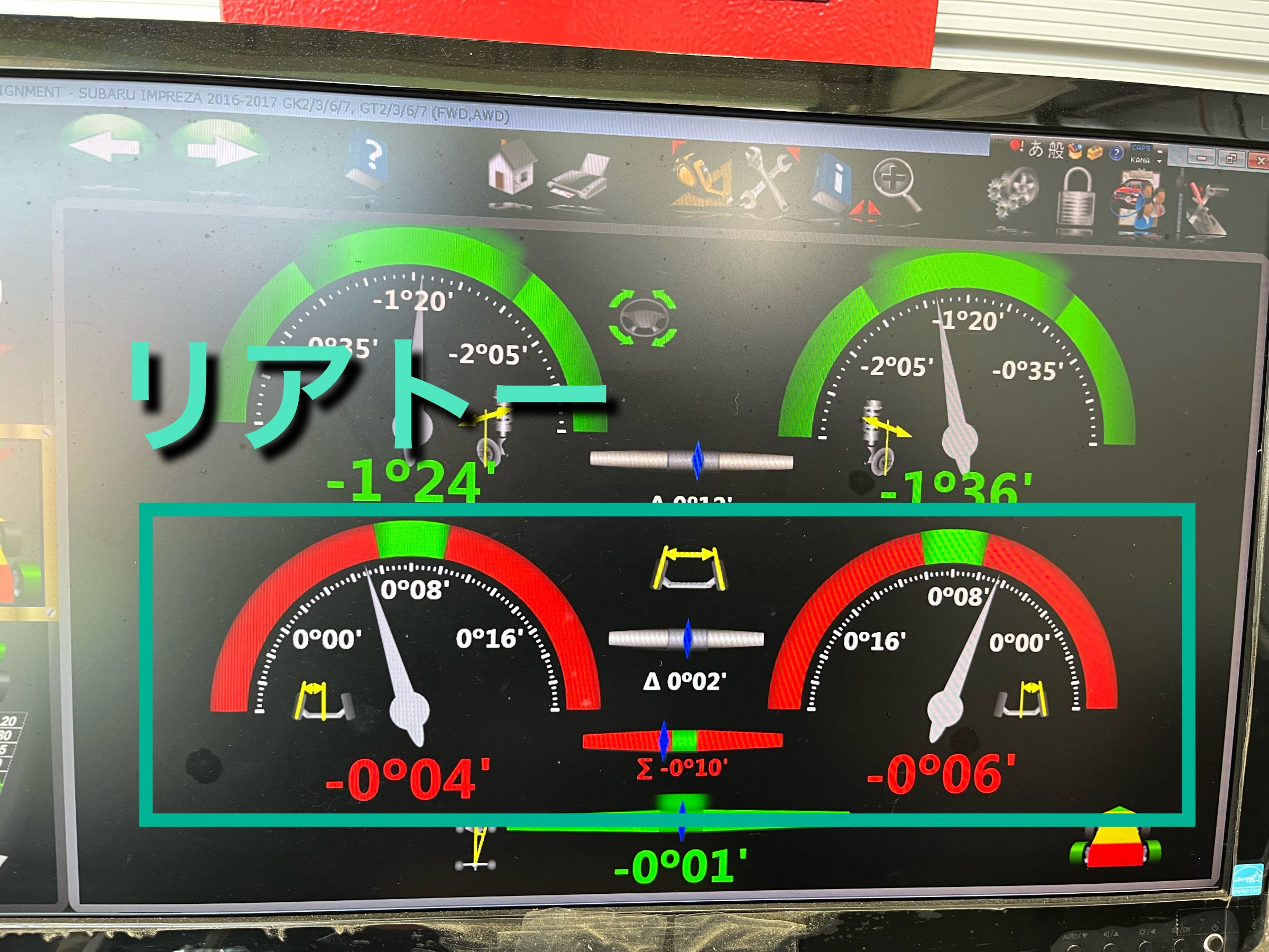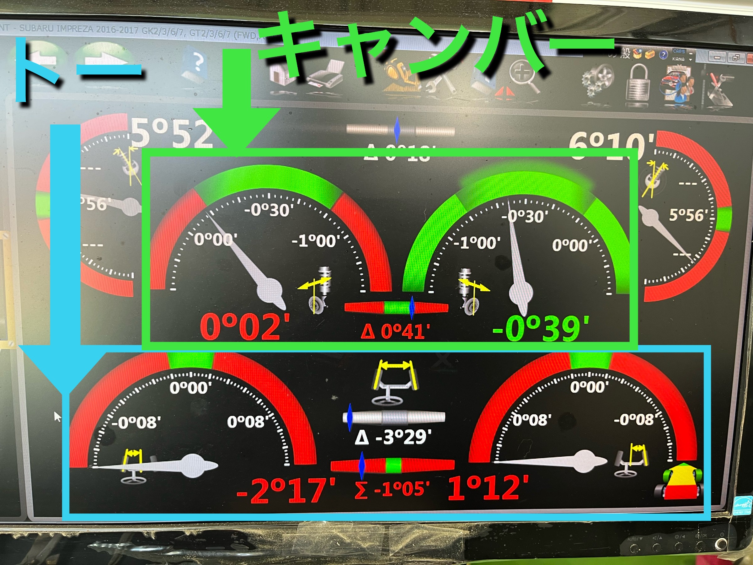 右フロントのキャンバー角以外、それぞれ基準値外の数字までずれていました。