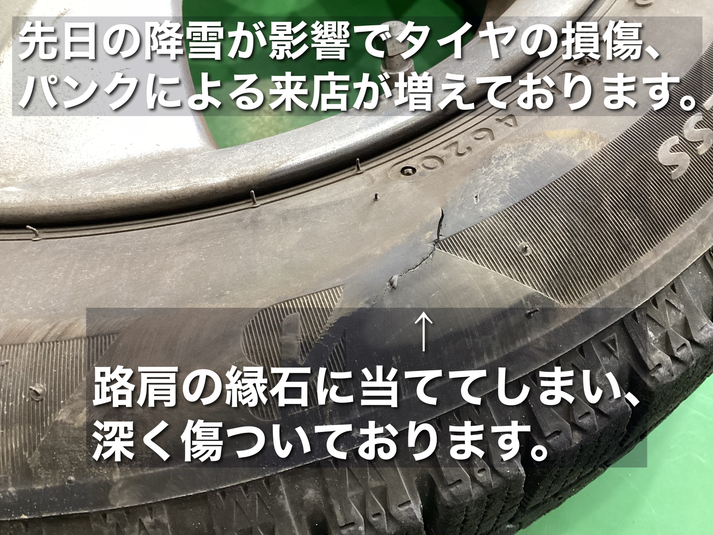 先日の降雪でタイヤを傷つけてしまった方、是非当店の無料タイヤ点検をうけてくださいね!