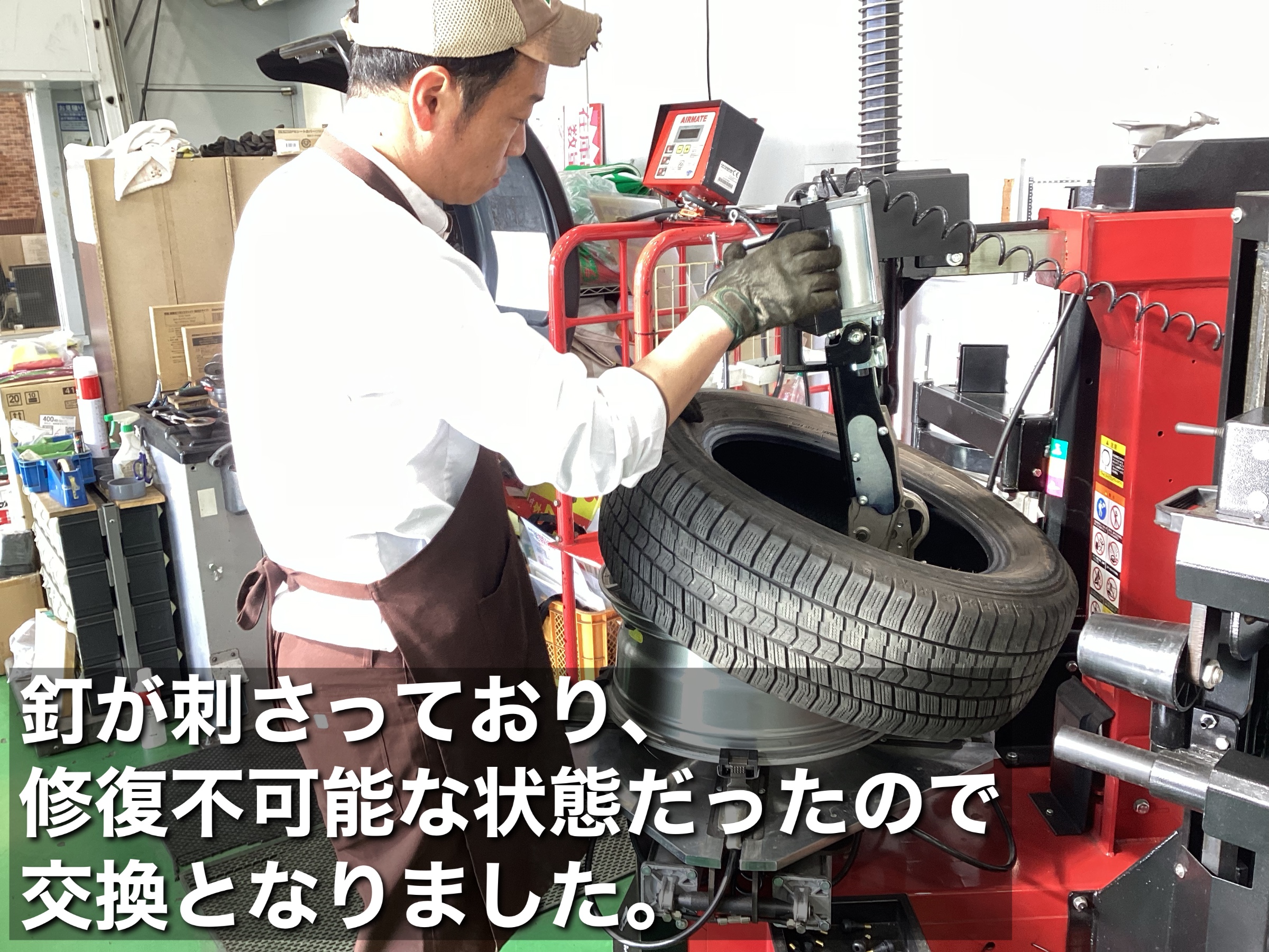 ↓ パンクしたタイヤには釘が刺さっており、ペシャンコの状態で走ってしまったのか修復不可能な状態でした。