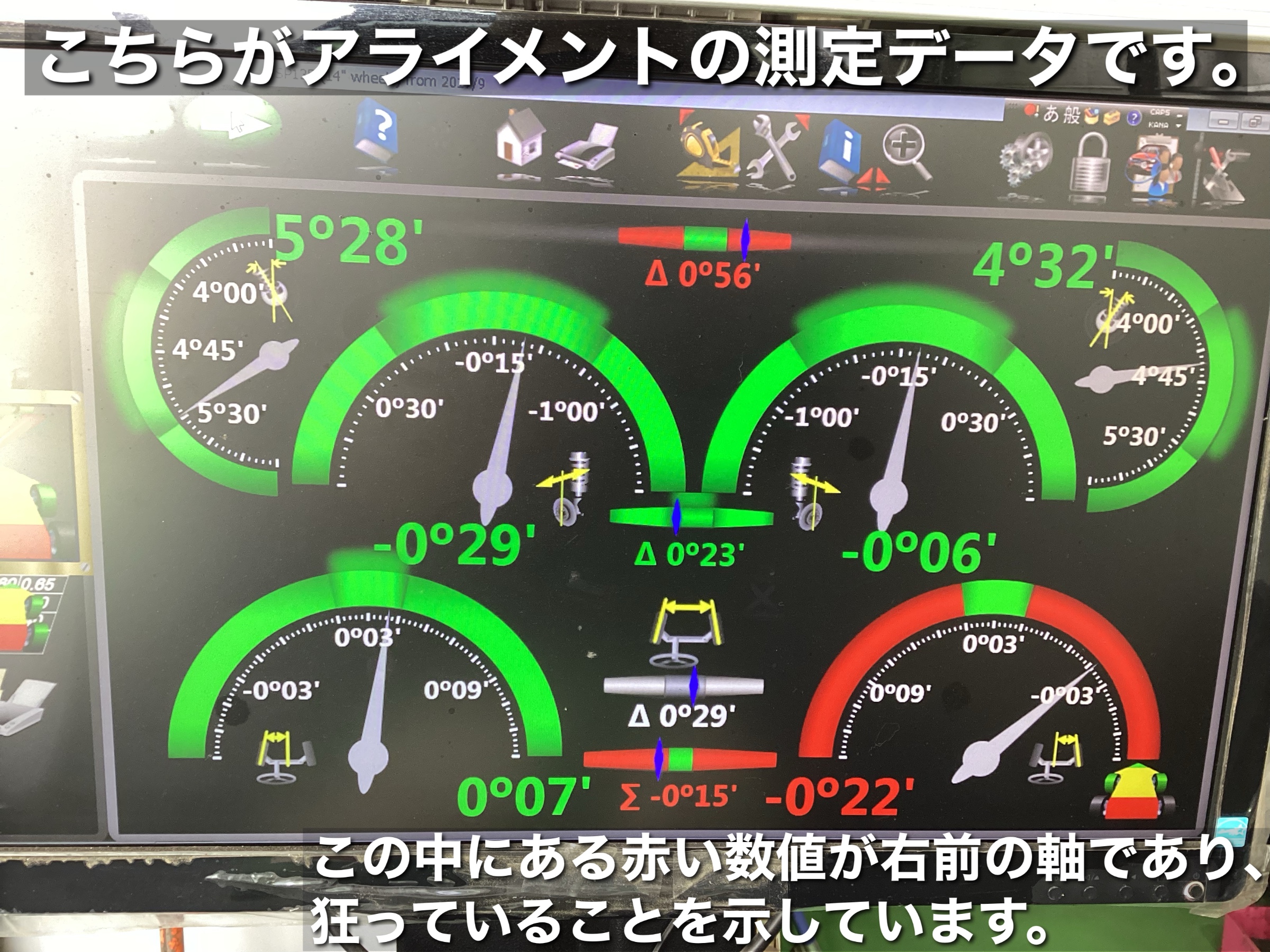 ↓ こちらが測定データ。このデータからわかるのは右前のタイヤが進行方向に対して右に傾いている事です。