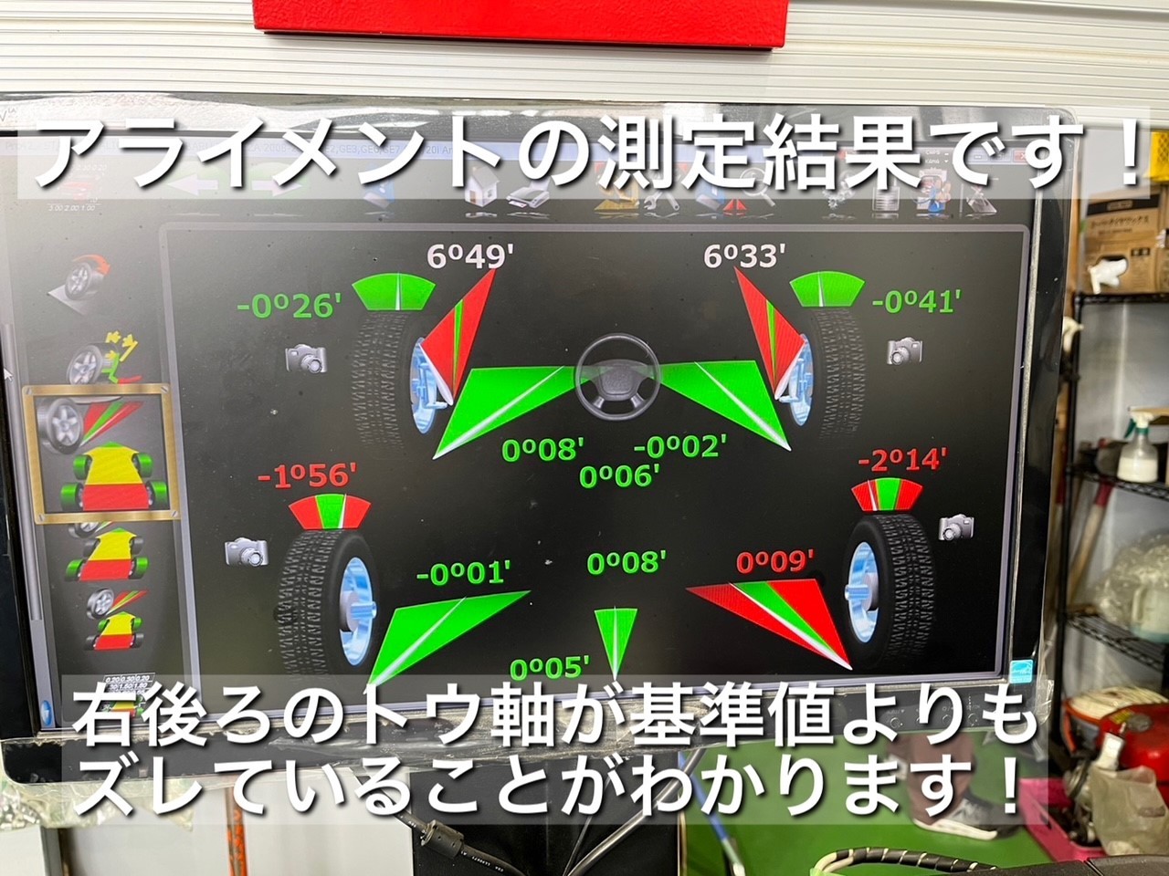 ↓ こちらが測定結果です。右後のトウ軸が基準値からズレており、赤くなっているのがわかります。