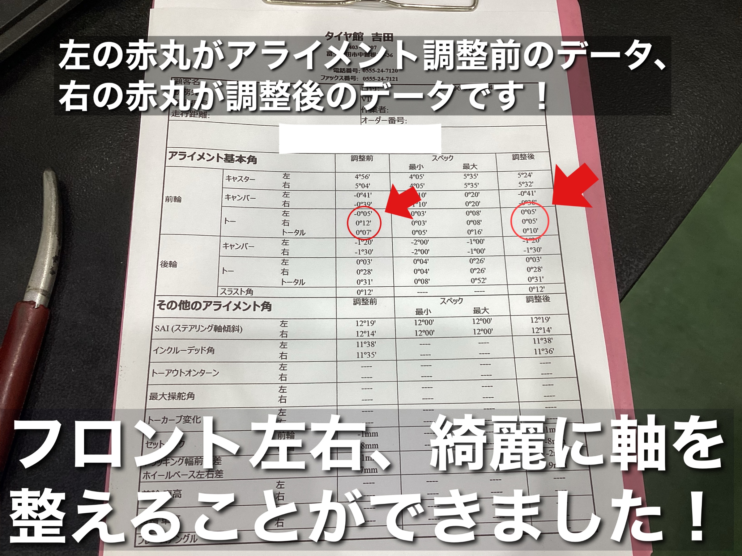 今回のハンドルズレの原因はフロントタイヤの軸が、進行方向の右にズレていたからでした。しっかりもとに戻させていただいて作業終了です。