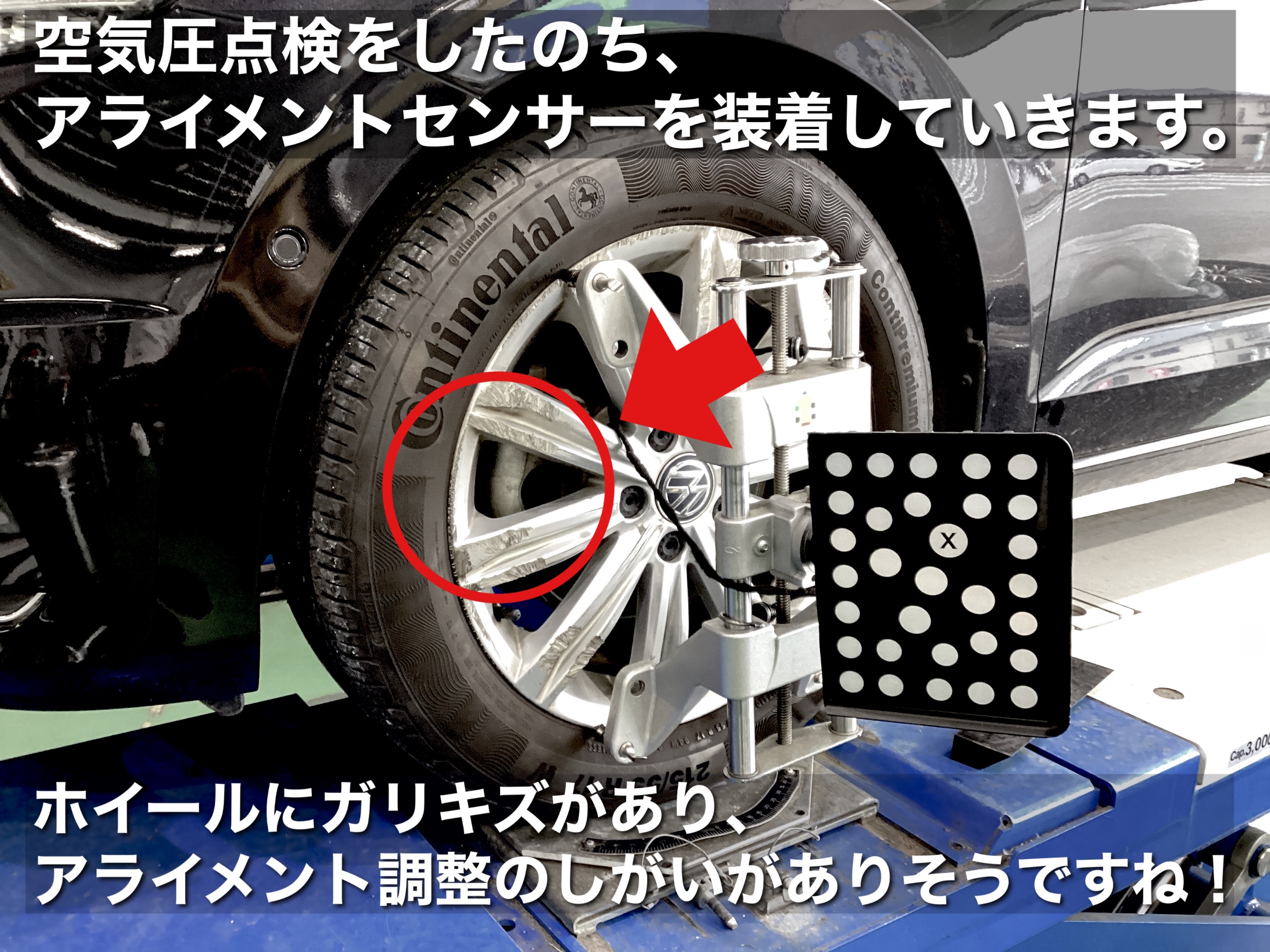 今回は縁石にタイヤを擦ってしまったとの事でアライメント調整となりました。