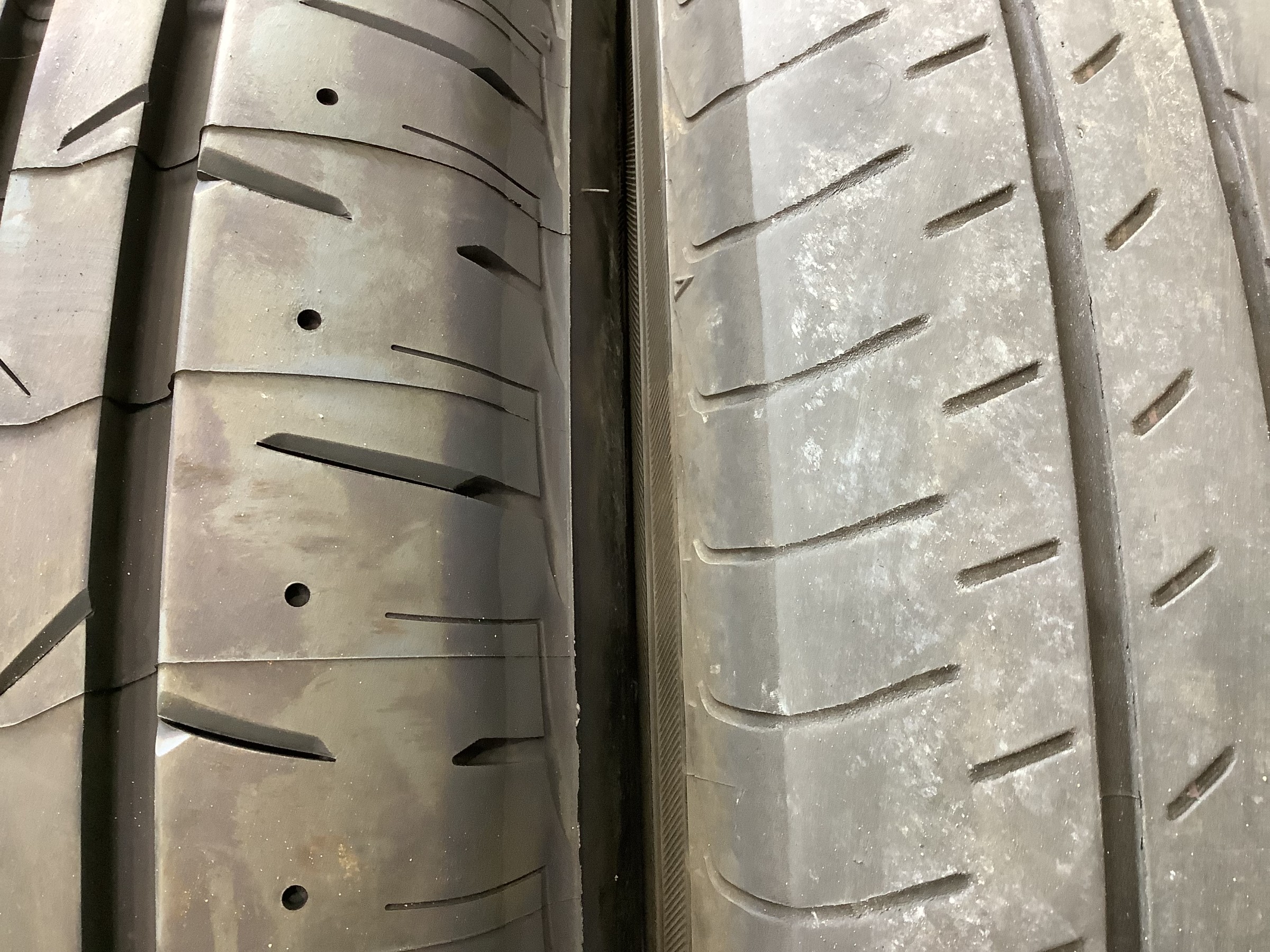 新品のタイヤと比較して溝が大きく減っており、かつショルダー部(端の部分)に偏って減っています。