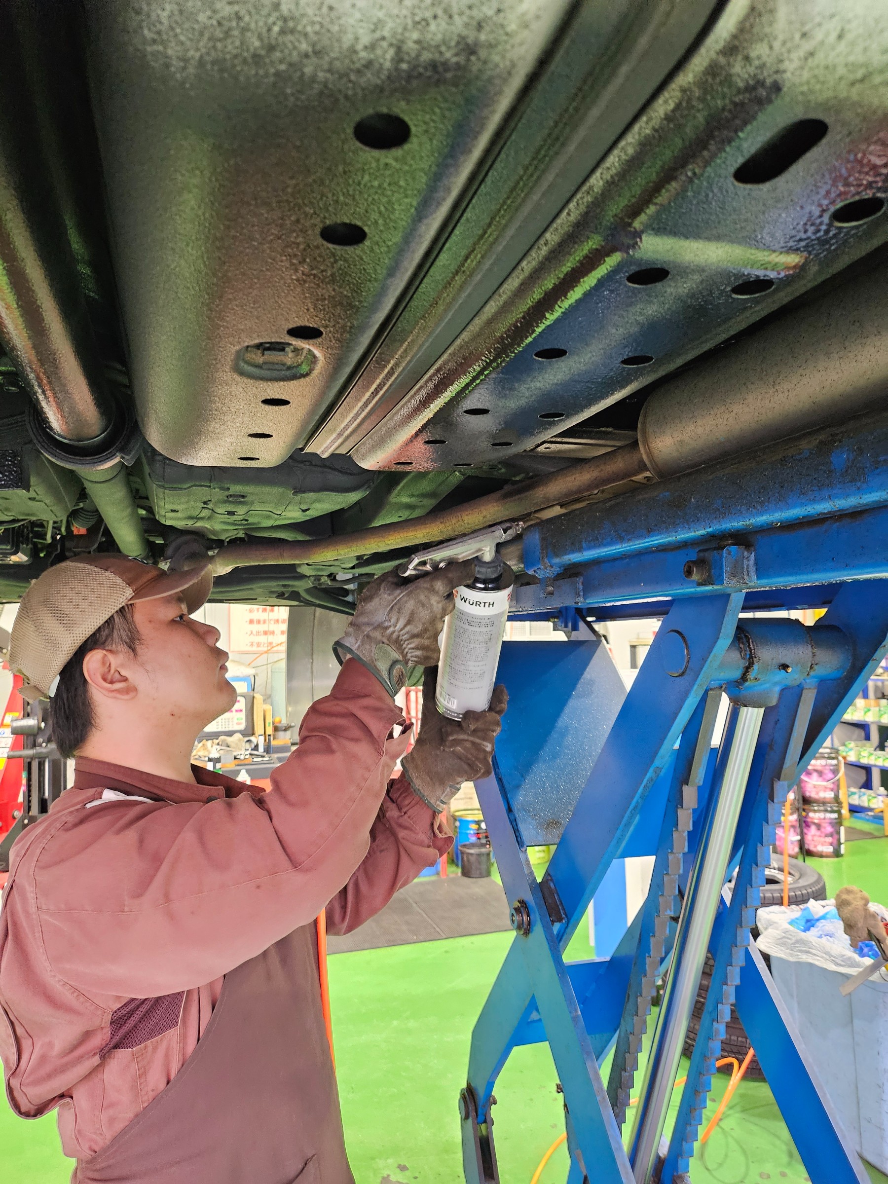 タイヤハウス内と車両の裏側の金属部分に施工していきます。