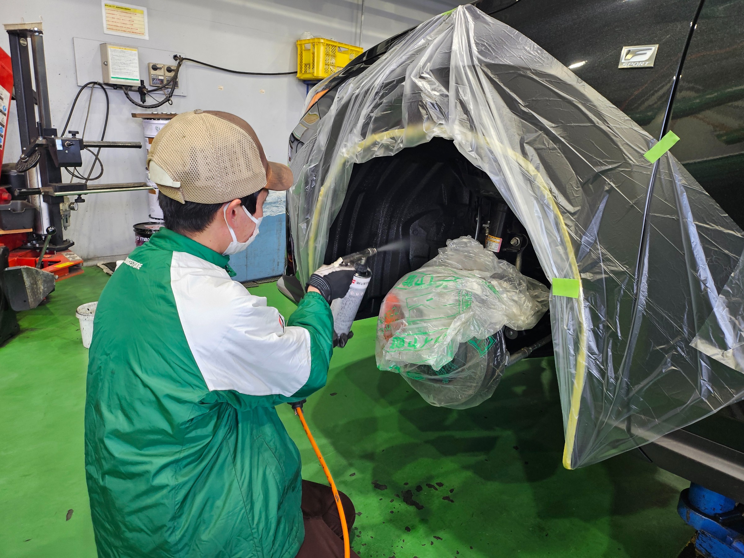 今回もパーフェクトコースをご用命いただきましたのでタイヤハウス内もコーティングしていきます。