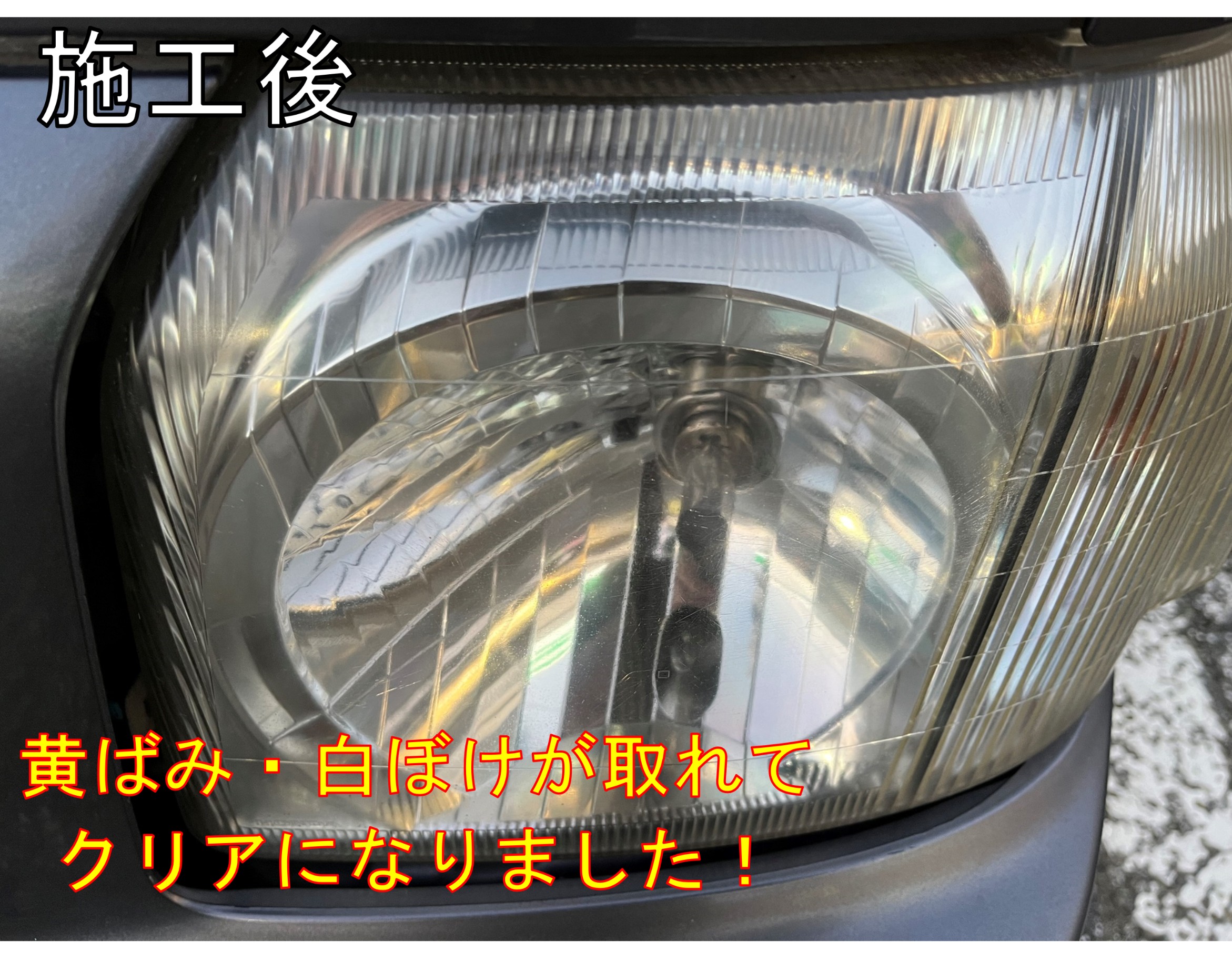 施工前は見えなかったレンズ内のヘッドライトバルブがはっきり見える状態になりました!