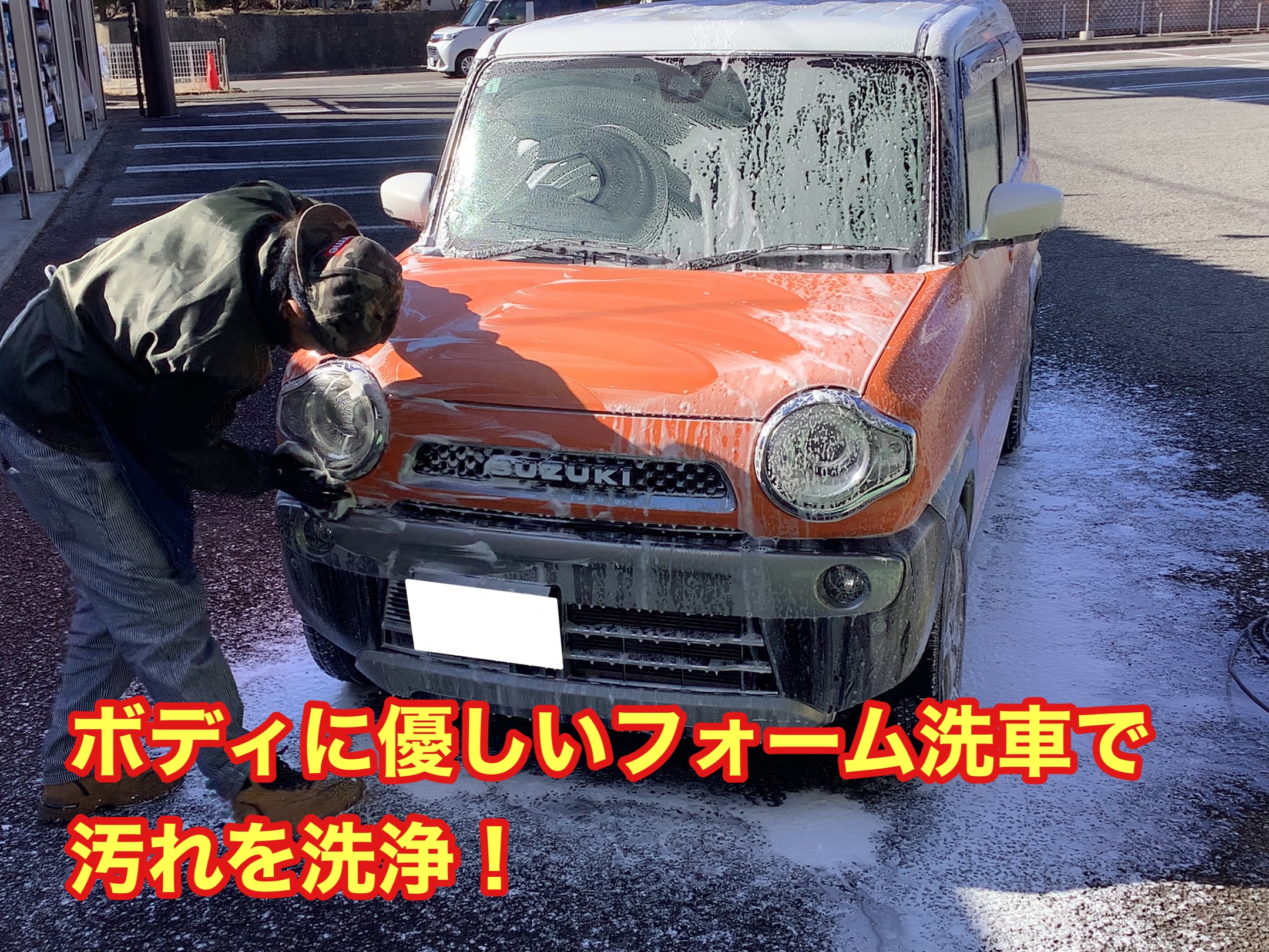 まずは、ボディ表面に付着していた汚れをフォーム洗車で落としていきます。
