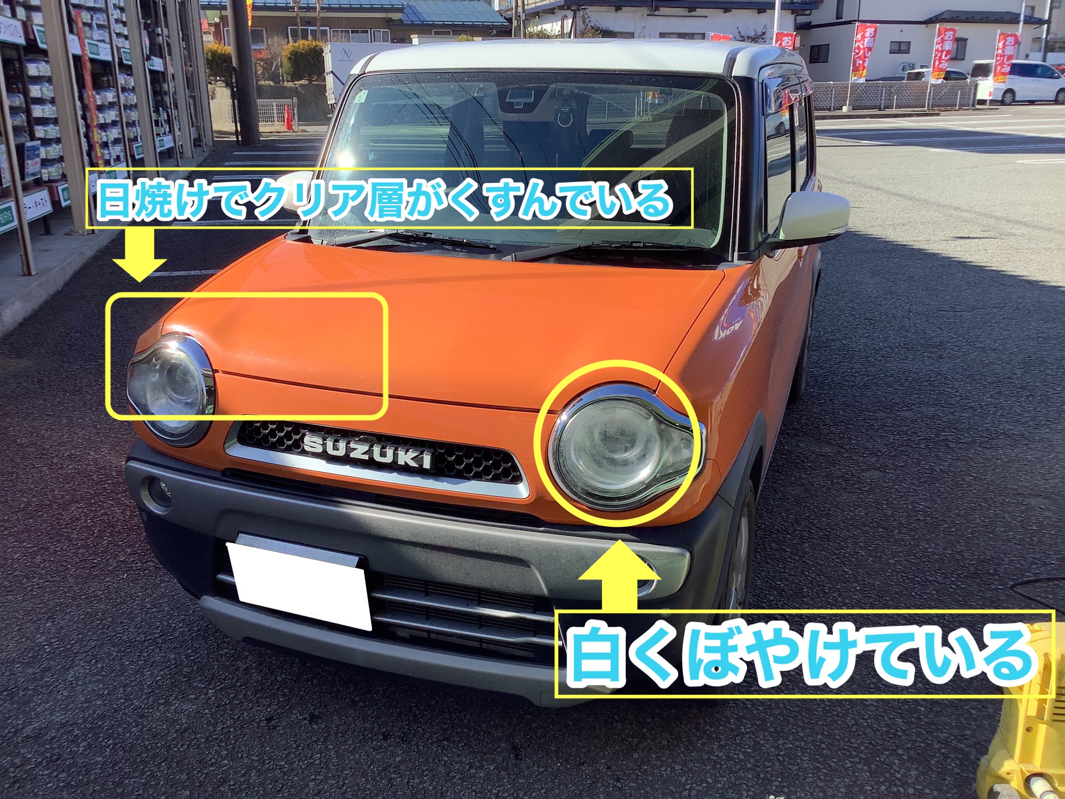 施工前の状態は、クリア層の傷みによりツヤ感が少なく、ヘッドライトレンズが白くくすんだ状態でした。
