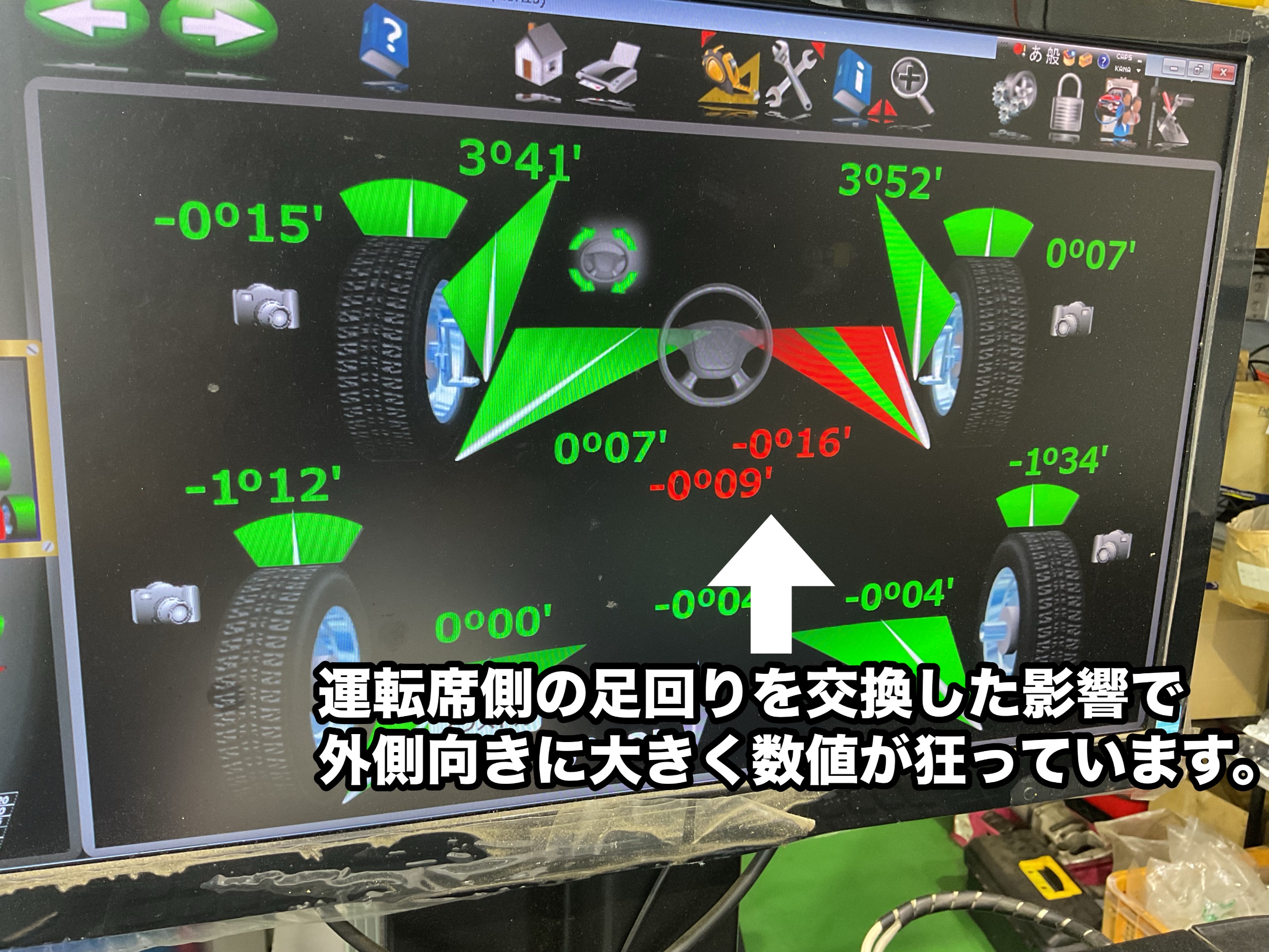 やはり部品交換をした運転席側が大きく外向きになっています。