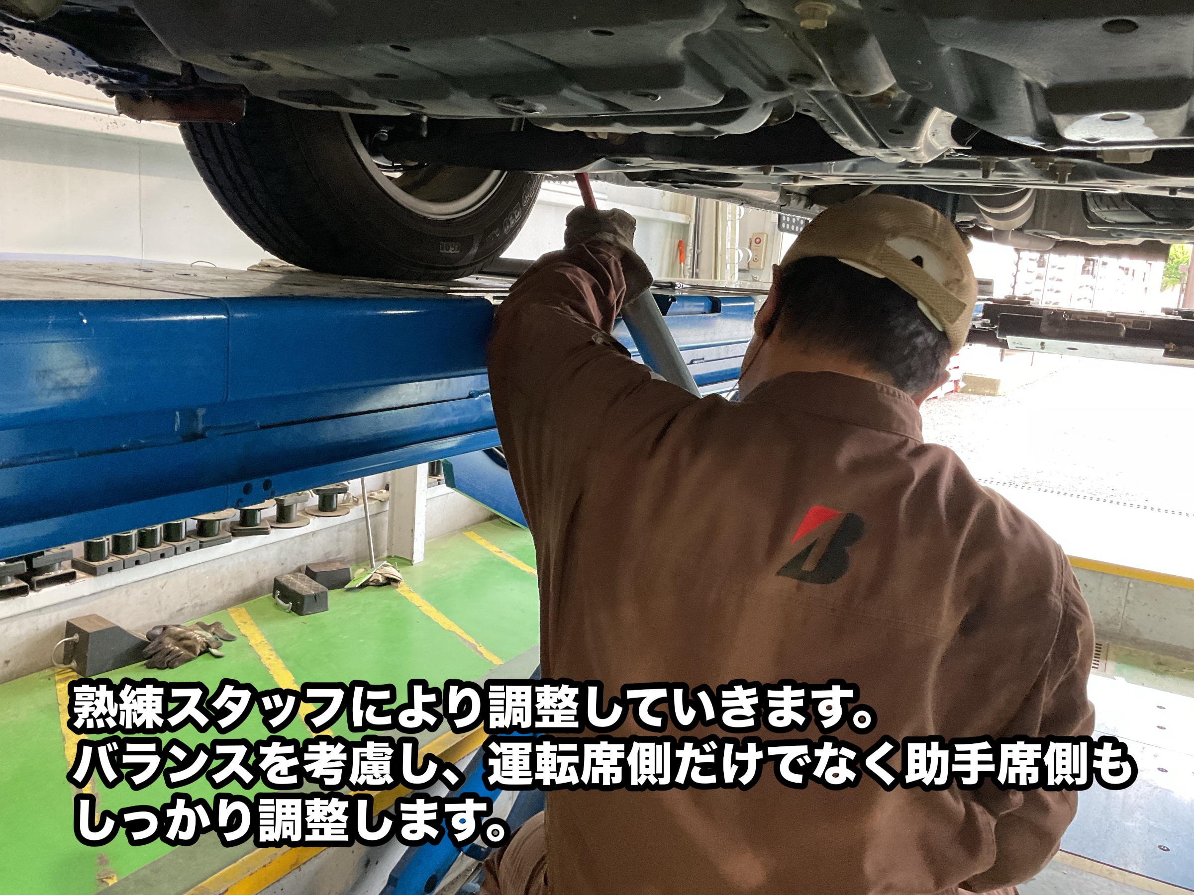 足回り部品の交換をすると基準値から大きくずれることがほとんどのため、測定・調整をしていきます。
