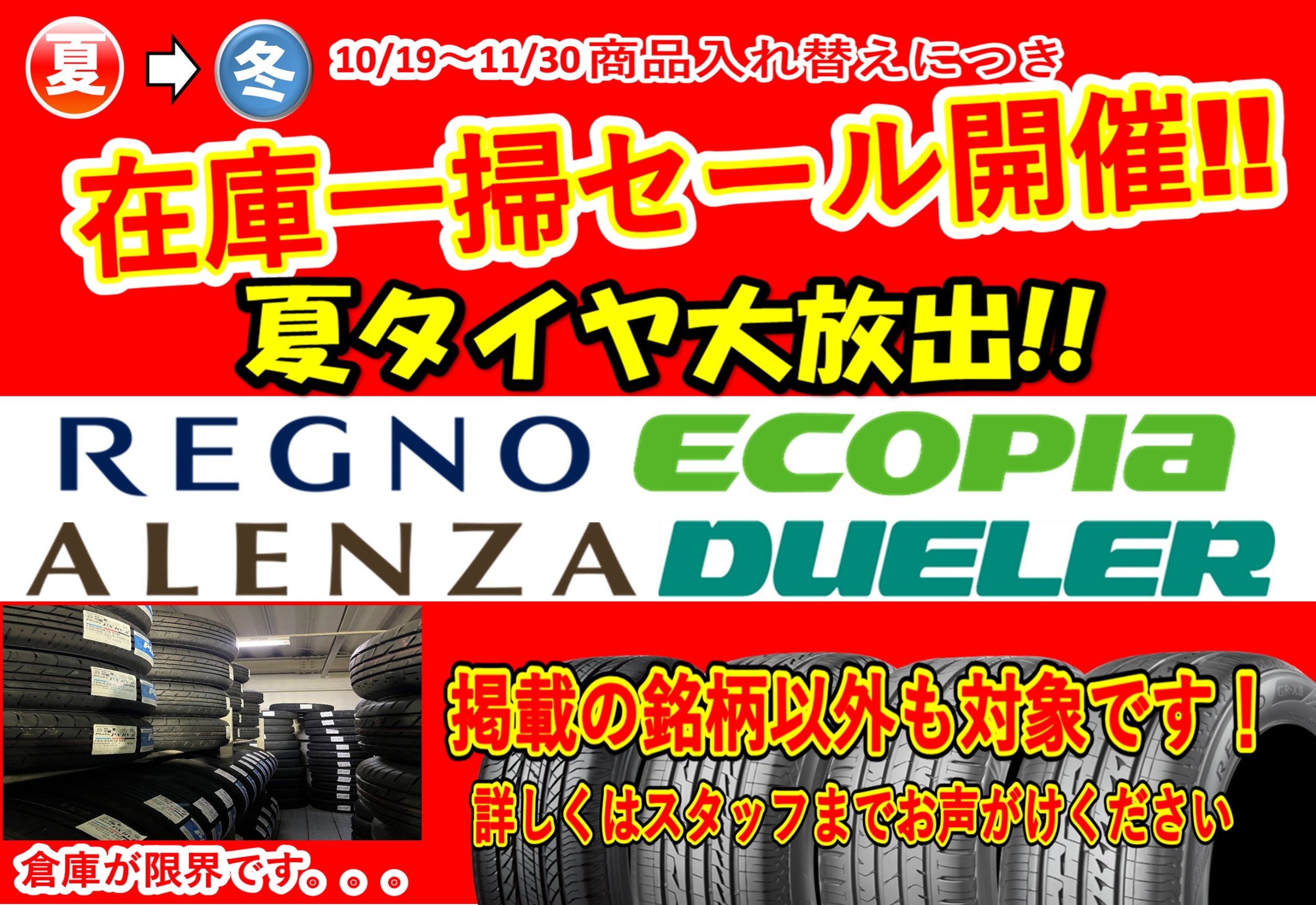 在庫一掃セール開催中! ポスト 2024年11月18日 在庫一掃セール開催中! ☆タイヤ在庫一掃セール開催いたします! 冬タイヤシーズン到来につきスタッドレスタイヤ大量入荷!...といきたいところなのですが、保管スペースがだんだんとキツキツになってきました。。。 そこで、夏タイヤと冬タイヤの商品の入れ替えのため、在庫一掃セールを開催いたします! 画像掲載の銘柄以外も対象となっております。 夏タイヤの交換時期が近い方はこの機会にぜひご相談ください! 皆様のご来店心よりお待ちしております。