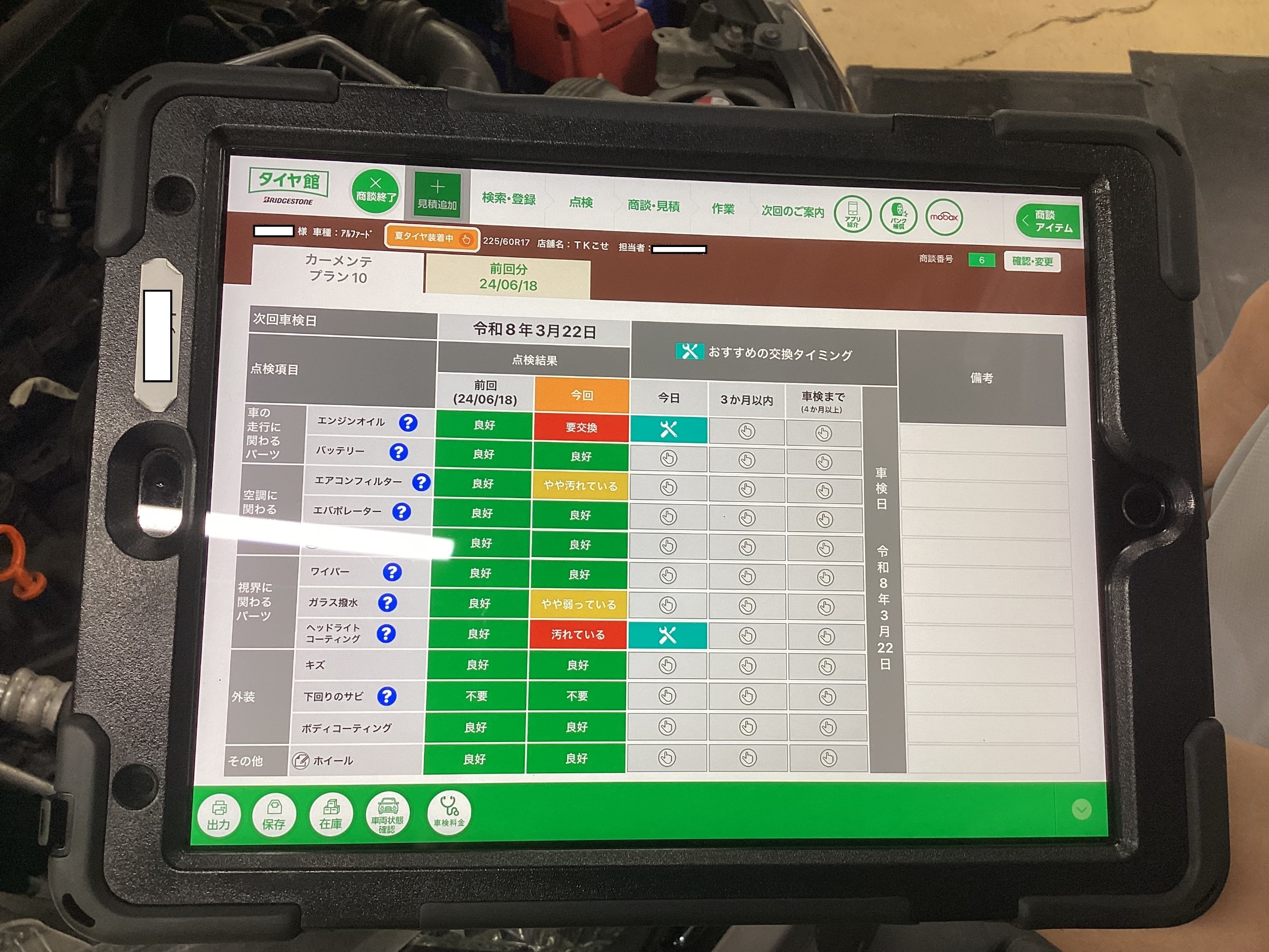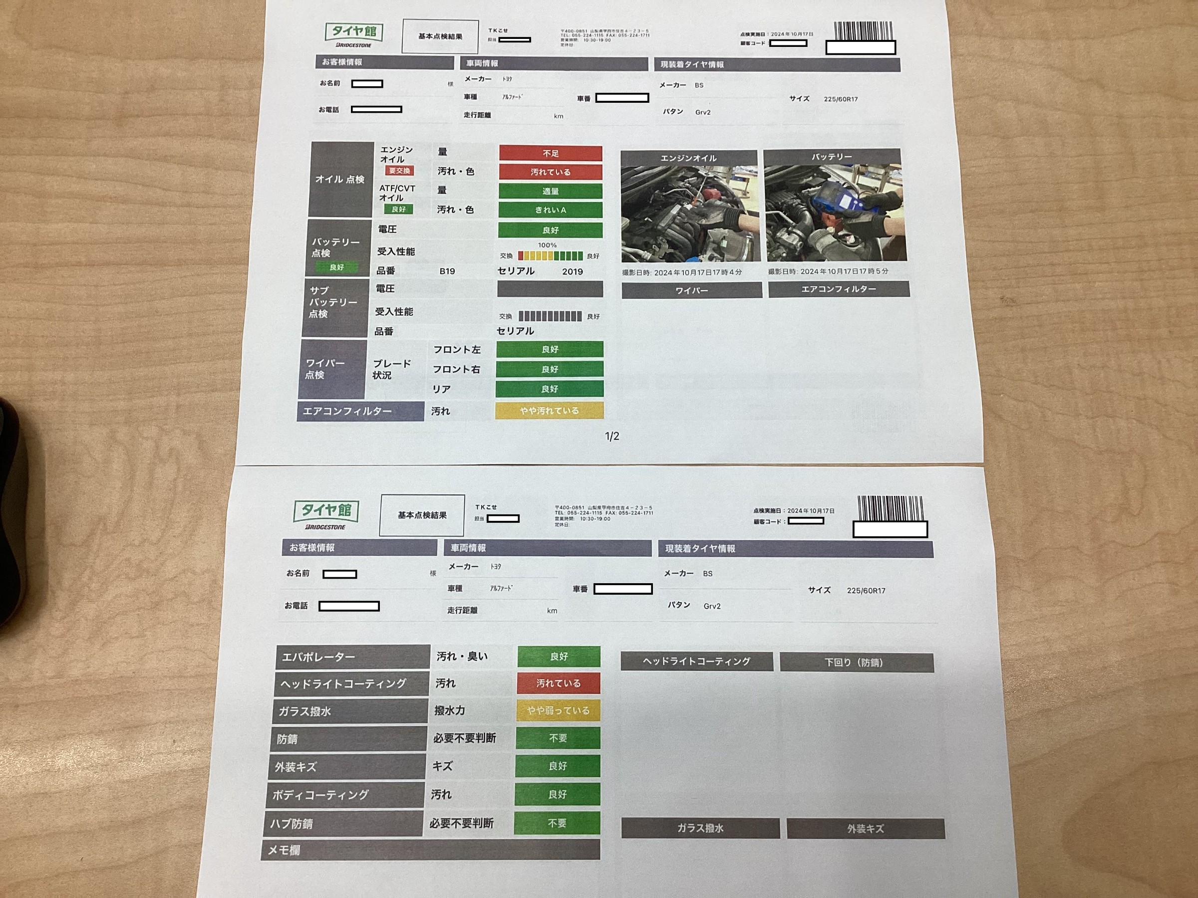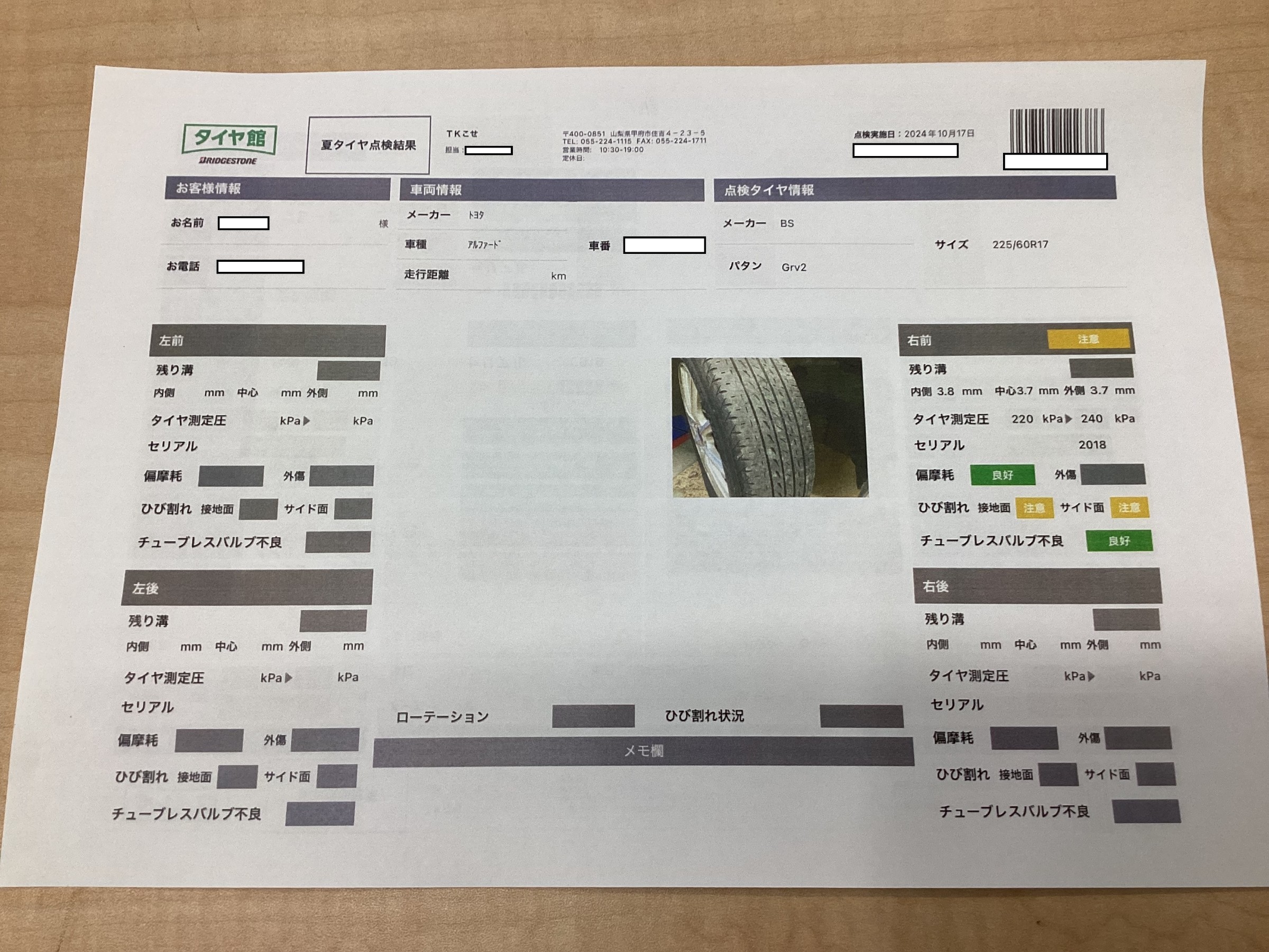 各輪の項目は…残り溝測定・空気圧チェック・劣化具合(ヒビ)