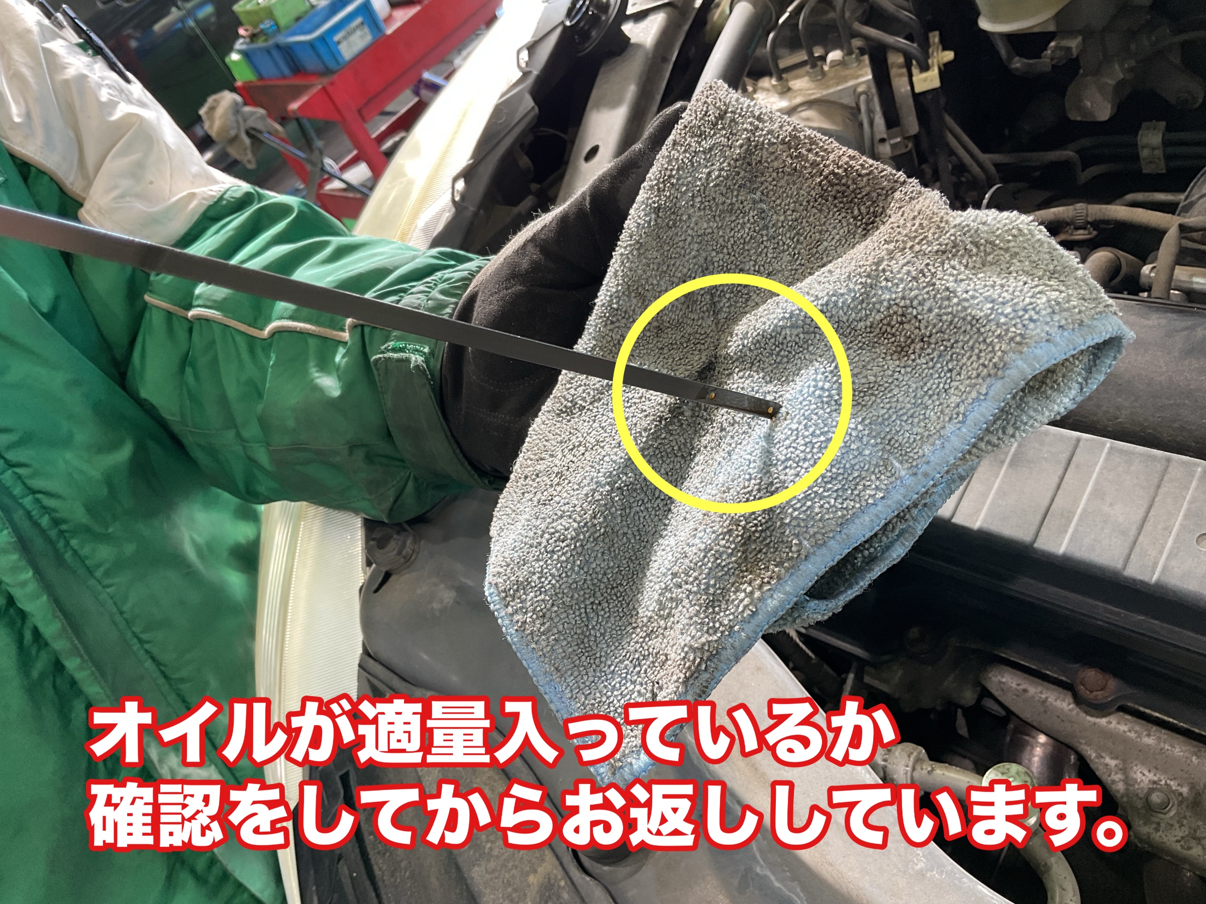 交換後はオイル量が問題ないことを2名のスタッフでダブルチェックをしてお返しします。