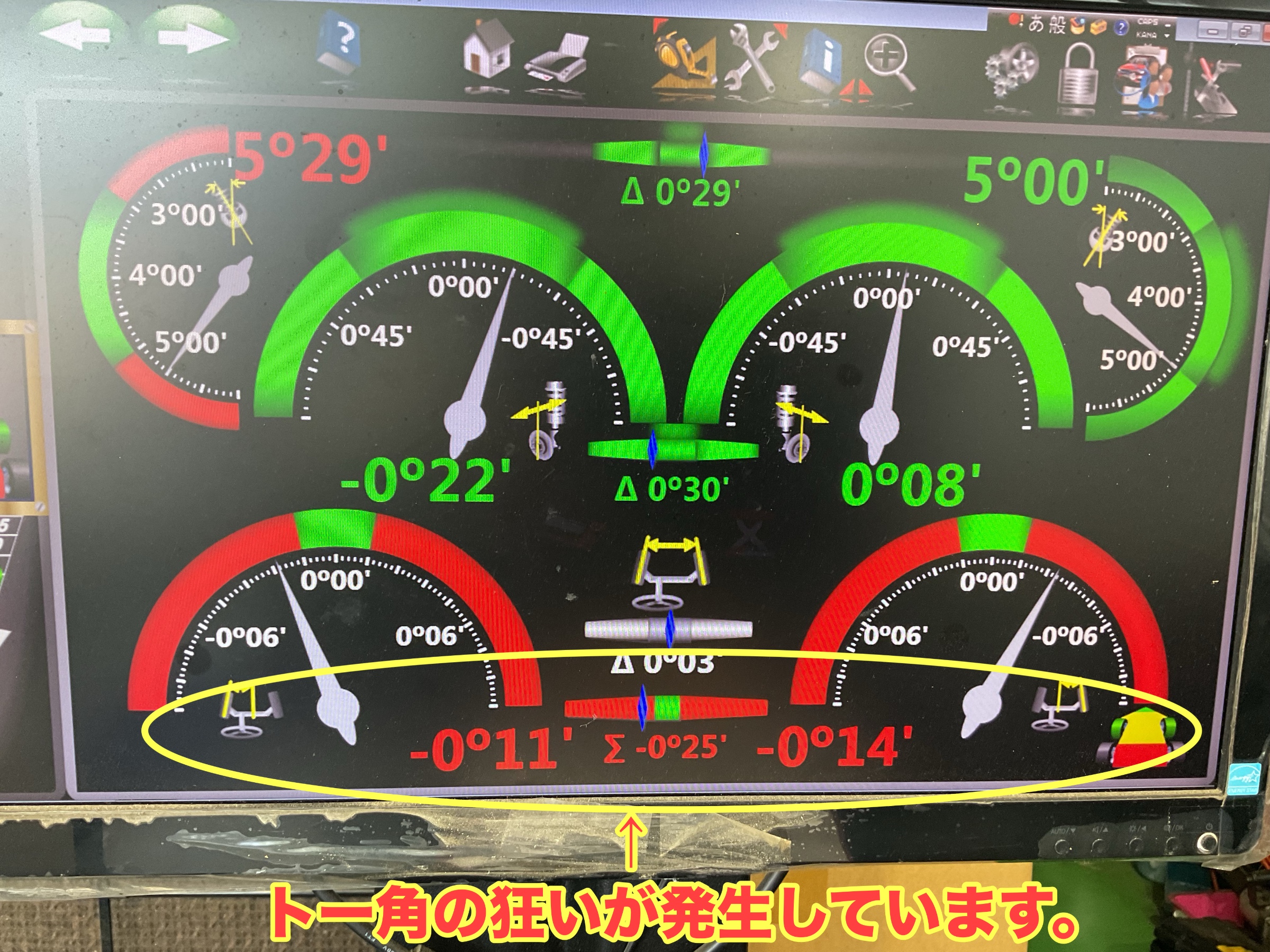 すると、前後ともにトー角の狂いが発生していることがわかりました!