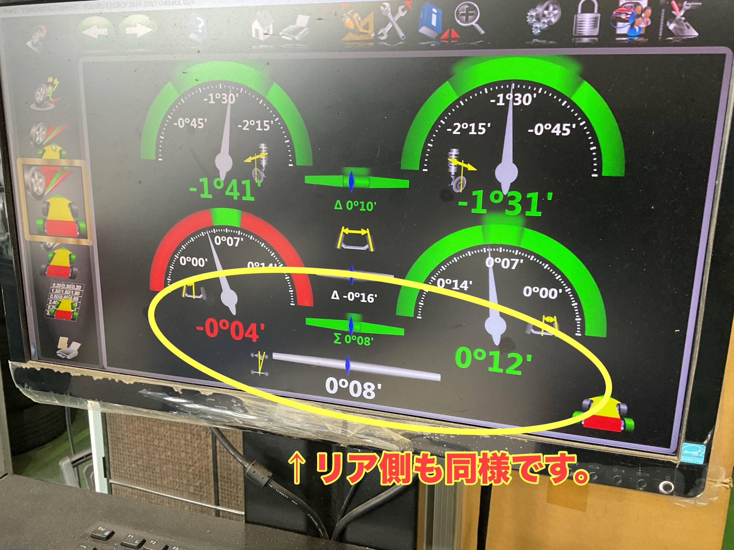 ホイールが歪むほどの衝撃でしたので、念のためアライメント測定もしてみることに。