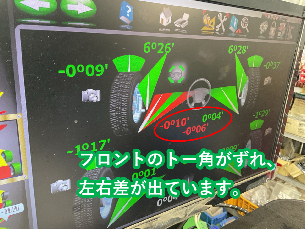 測定結果は画像の通りで、助手席側がトーアウト、運転席側がトーインとなっていました。