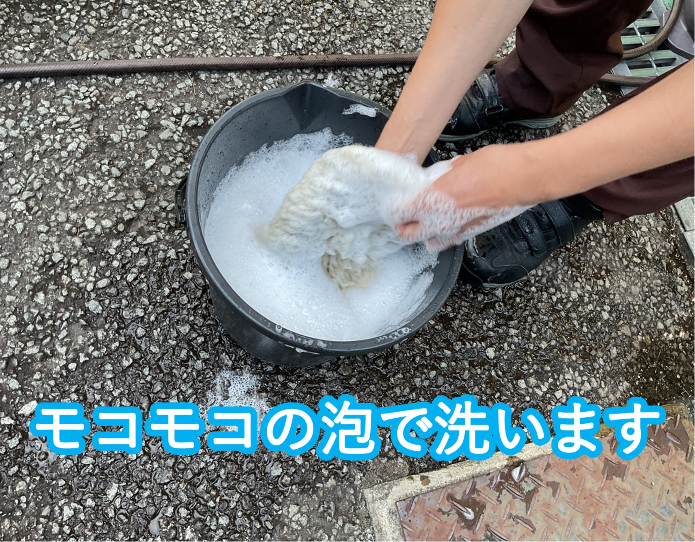 ボディが十分に冷えたところでモコモコの泡でボディを傷つけないよう洗っていきます。