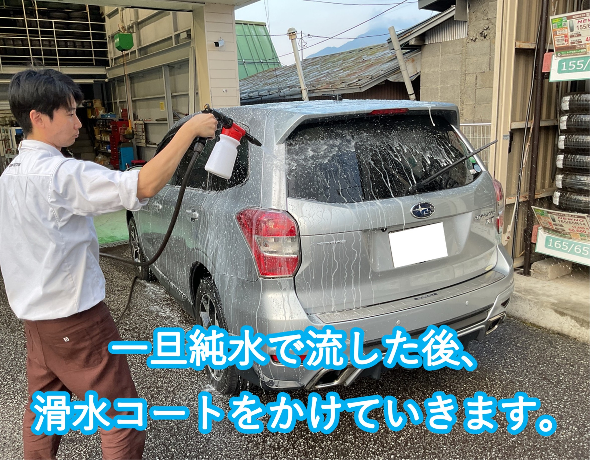 こちら、今回は純水滑水洗車のご紹介でしたが、コーティングが既にかかっているお車向けに滑水コート無しの純水洗車もございます。