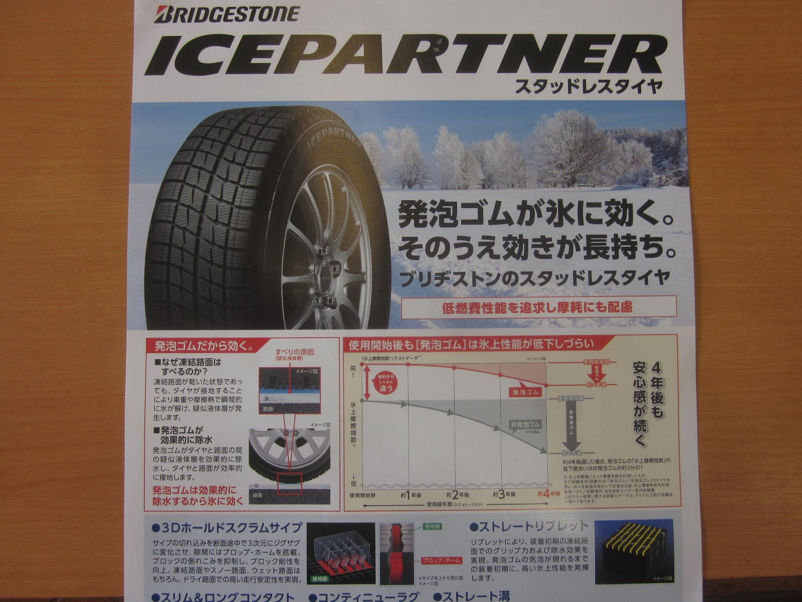 そろそろ冬シーズンっつ~こんでスタッドレスタイヤの話題を一つ・・・ブリヂストンのお値打ちモデルに「アイスパートナー」という商品があります★お値段重視の商品ではありますが、ブリヂストン独自の発泡ゴムを採用しているのであります\(゜ロ\)(/ロ゜)/なので効きが長持ち・・・安心感も長持ちしますよ~☆