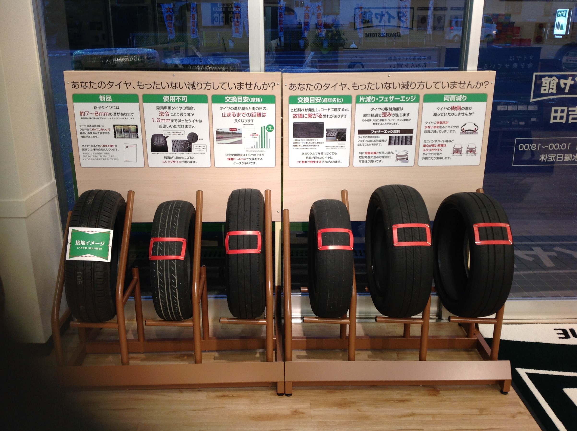 当店にも展示があるのですが、ハガキ一枚分だけで車を支えているんですよ★ひょっとしたら気付かないうちにタイヤの溝が少なくなっている、、、ひび割れが出てきているかも・・・\(◎o◎)/