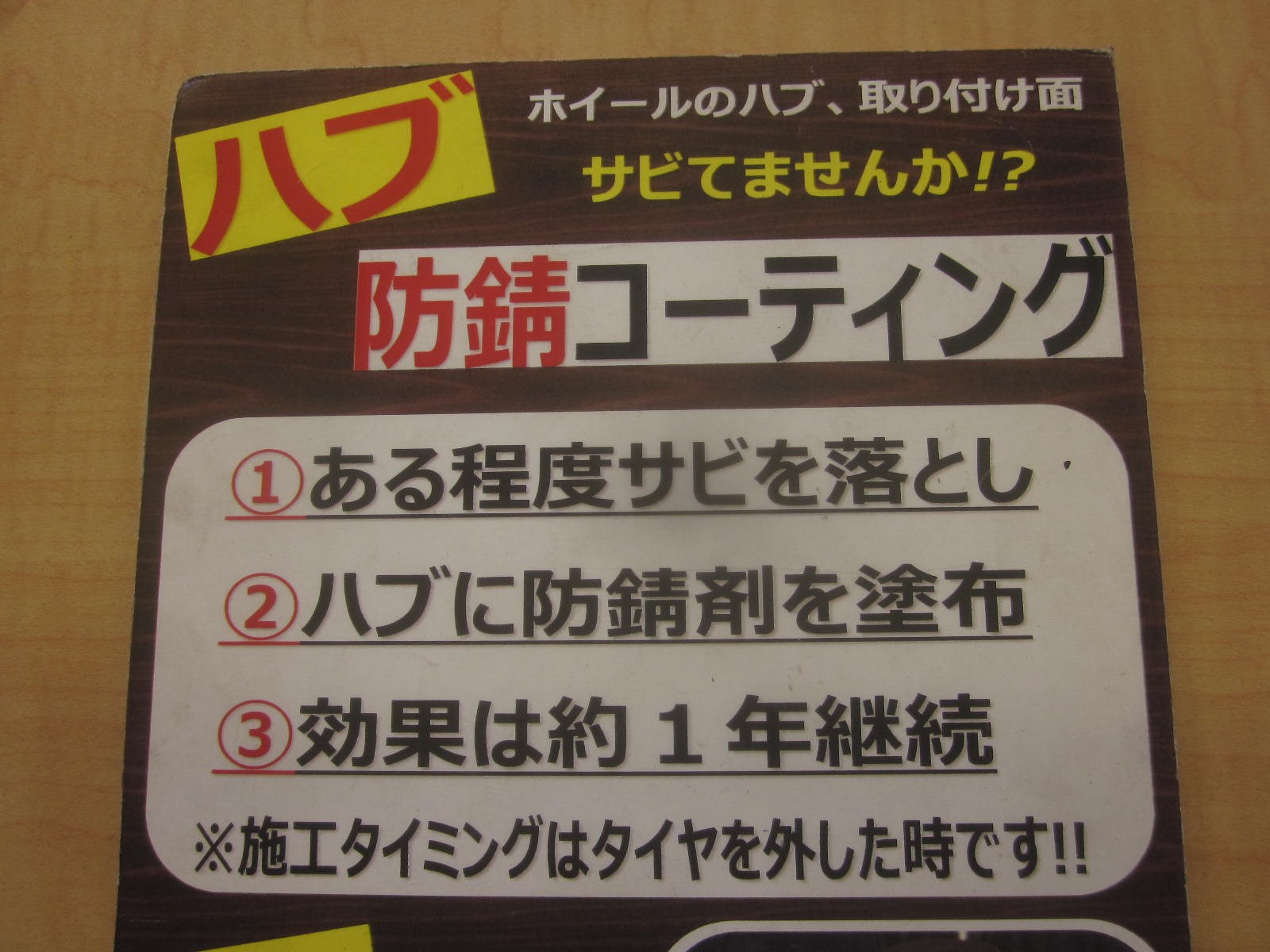 ☆富士吉田地方オススメの・・・★ ポスト 2017年12月19日 こんちは~、タイヤ館 吉田店です★ もう気温は氷点下を下回り、道路には凍結防止剤が撒かれ始めていますね~!!皆様のお車は錆止め対策はされてますでしょうか!? こちらは当店一押し、タイヤ/ホイール取付面の錆止コーティングでございます\(◎o◎)/錆びたまま取り付けてしまうと、最悪外れにくくなってしまうこともありますのでぜひ施工しておいてくださいね~(^_-)-☆ 担当:天野