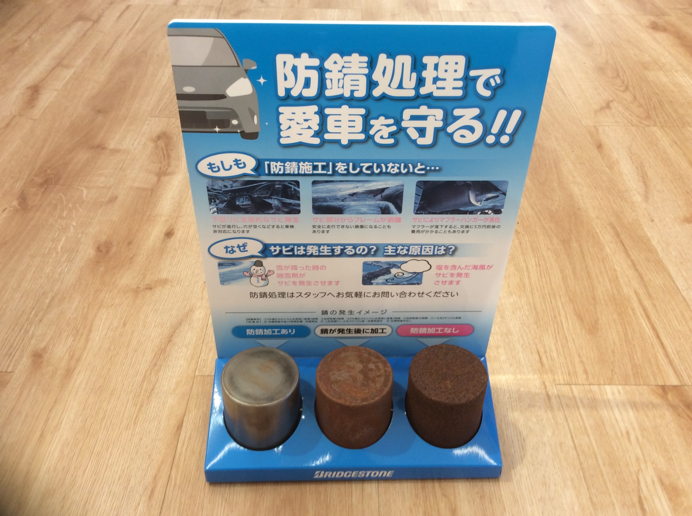 ところでついに来ました、、、塩カルシーズン・・・お車の錆止め処理は済んでいますでしょうか!?このように当店では錆止めのコーティングも行っていますので、ぜひ施工サンプルだけでも見にいらしてくださいね~(^_-)-☆