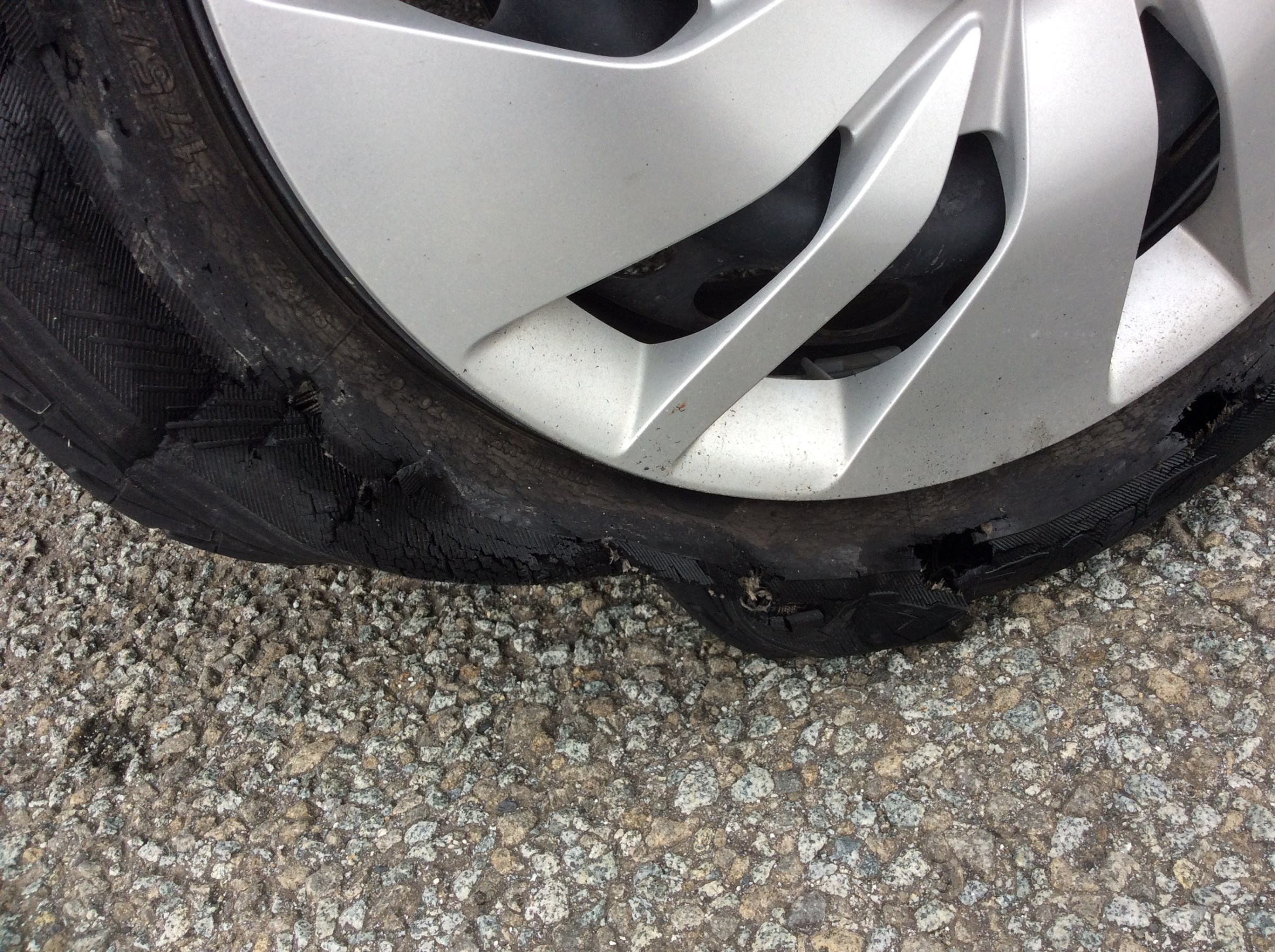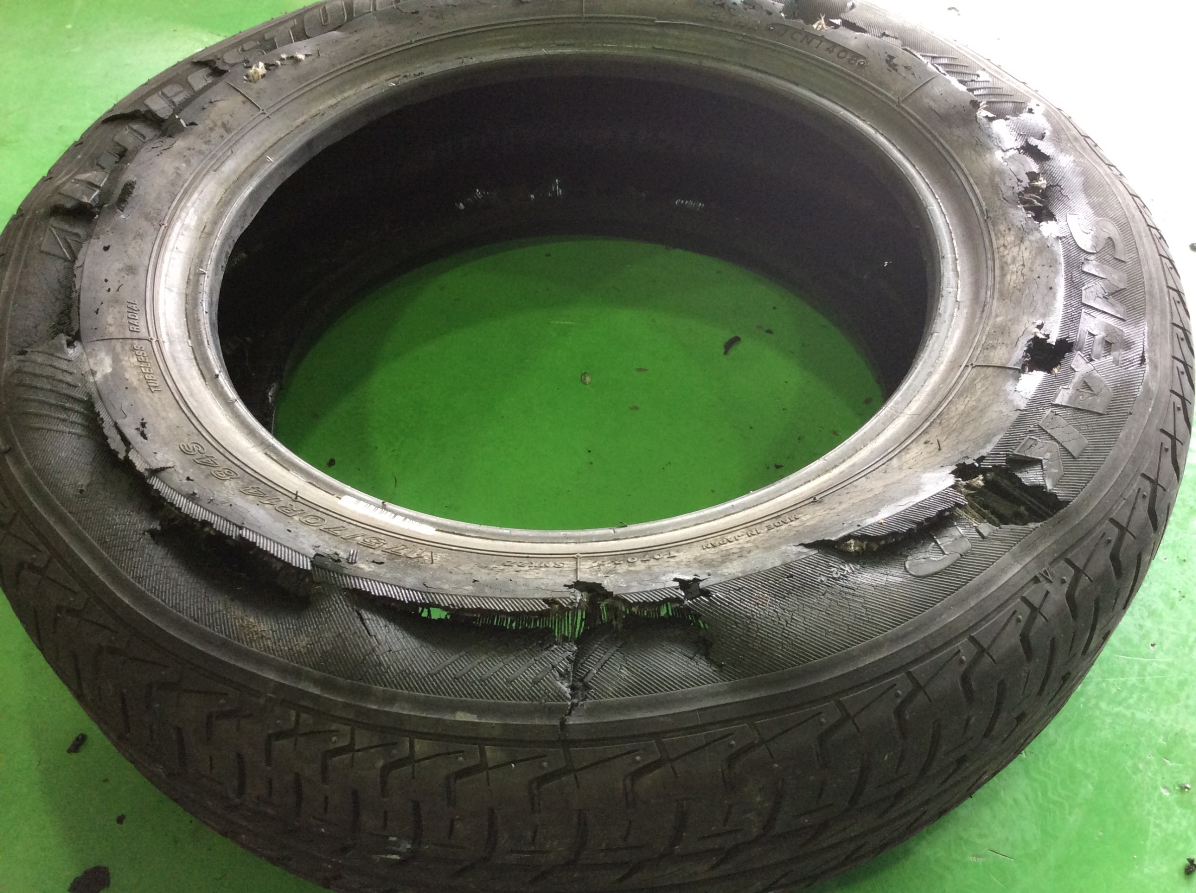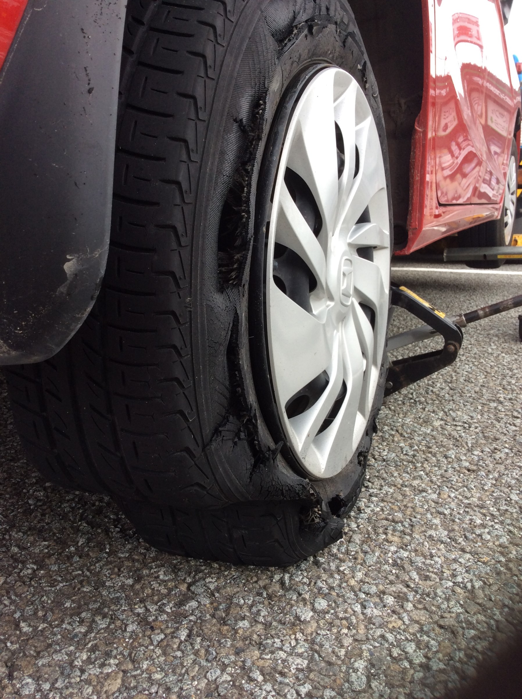 知らずのパンク走行の危険 ポスト 2018年7月9日 こんにちは。 タイヤ館 吉田店です(≧▽≦) 衝撃で~す(*_*) HONDA FIT パンクしていた事に気が付かず走行!(汗) 気が付いた時には・・・・・・・・・ 新品タイヤ NEXTRY ↓ 皆さんも気を付けてくださいね(>_<)