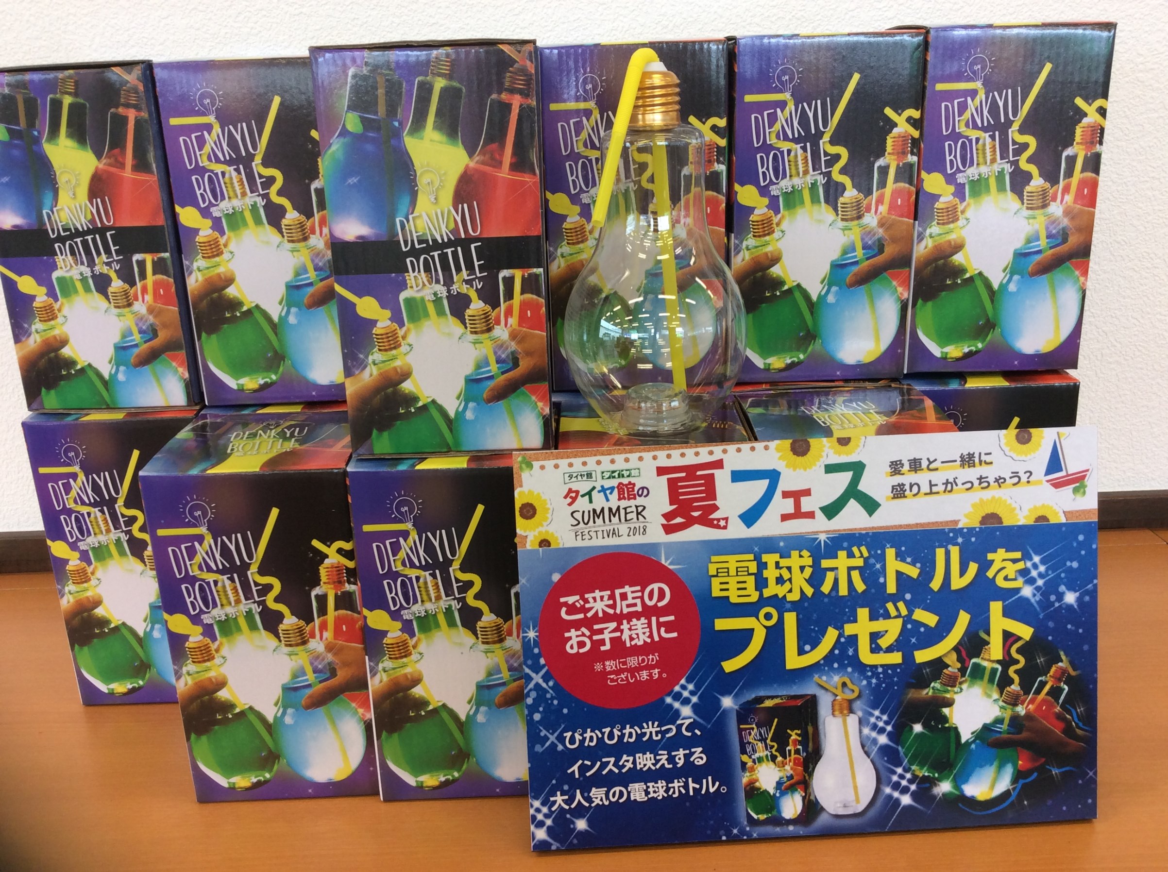夏フェス! ポスト 2018年7月12日 こんにちは タイヤ館 吉田店です 今週7/14(土)からタイヤ館のSUMMER FESTIVAL 2018 夏フェス ~愛車と一緒に盛り上がっちゃう?~を開催致します。 また、ご来店のお子様に電球ボトルをプレゼント(^v^) ぴかぴか光ってインスタ映えする電球ボトル!! 好きなドリンクを入れて光と一緒にお楽しみください お待ちしております