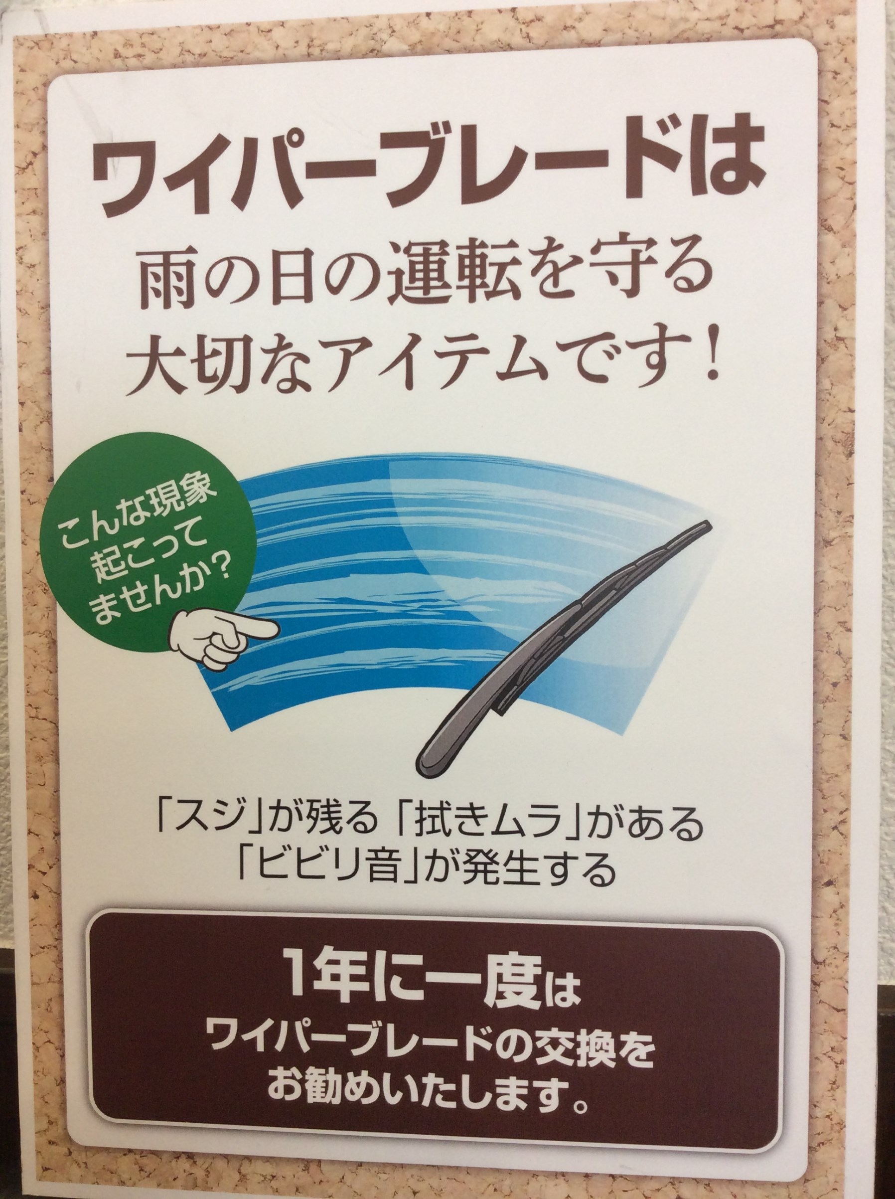 ワイパー交換 ポスト 2018年8月12日 最近は午後から雨が強く降ることがありますが みなさんワイパーはしっかりと使えていますか? 長く使用するとゴムの劣化から水捌けが悪くなってしまったり 音が鳴るようになったりと性能が低下。 目安としては1年1回ほどで交換がおすすめですが いつ変えたかわからない!という方は当店でゴムの劣化具合を点検致しますので お気軽におこしください。