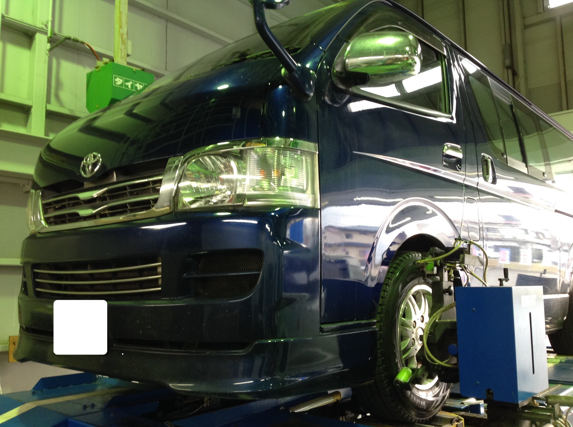 ↓ こちらはハイエースのアライメント。タイヤの溝がものすごい勢いで内減するとのことで調整させていただきました。^^
