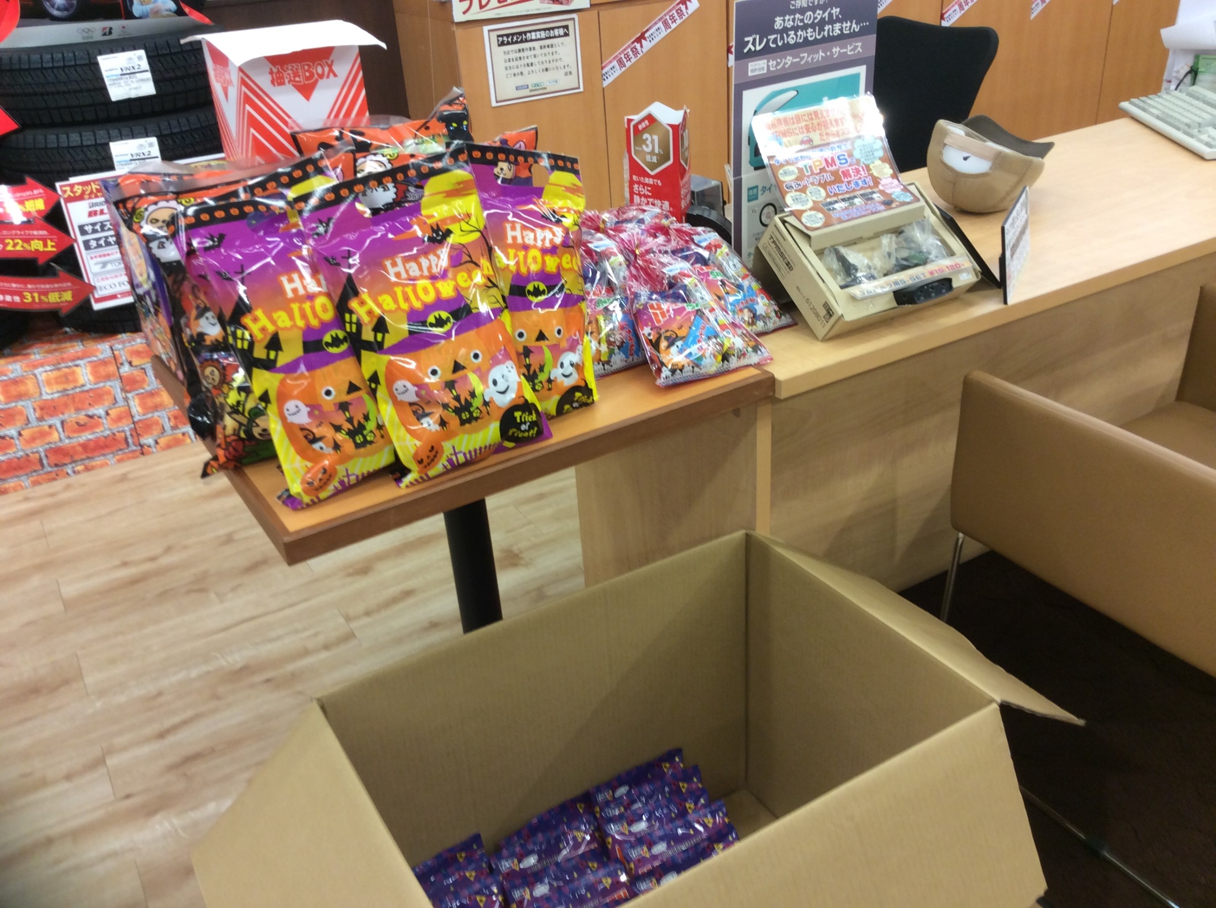 ハロウィンが近づいてきました ポスト 2018年10月19日 こんにちは 本日、タイヤ館吉田店ではハロウィンに向けての店内飾り付けをしていました。 とてもポップな感じに仕上がって、見ているだけで楽しくなってきますよ! さらにこんな物も用意しています! お菓子が当たるくじ引きです! A賞はなんとお菓子がたっぷり入ったBOX! その他にも色々なお菓子をご用意しています。 お子様をお連れの方は是非ご来店下さい! 大人の方でも引けますよ! ご来店お待ちしています! 担当:刑部