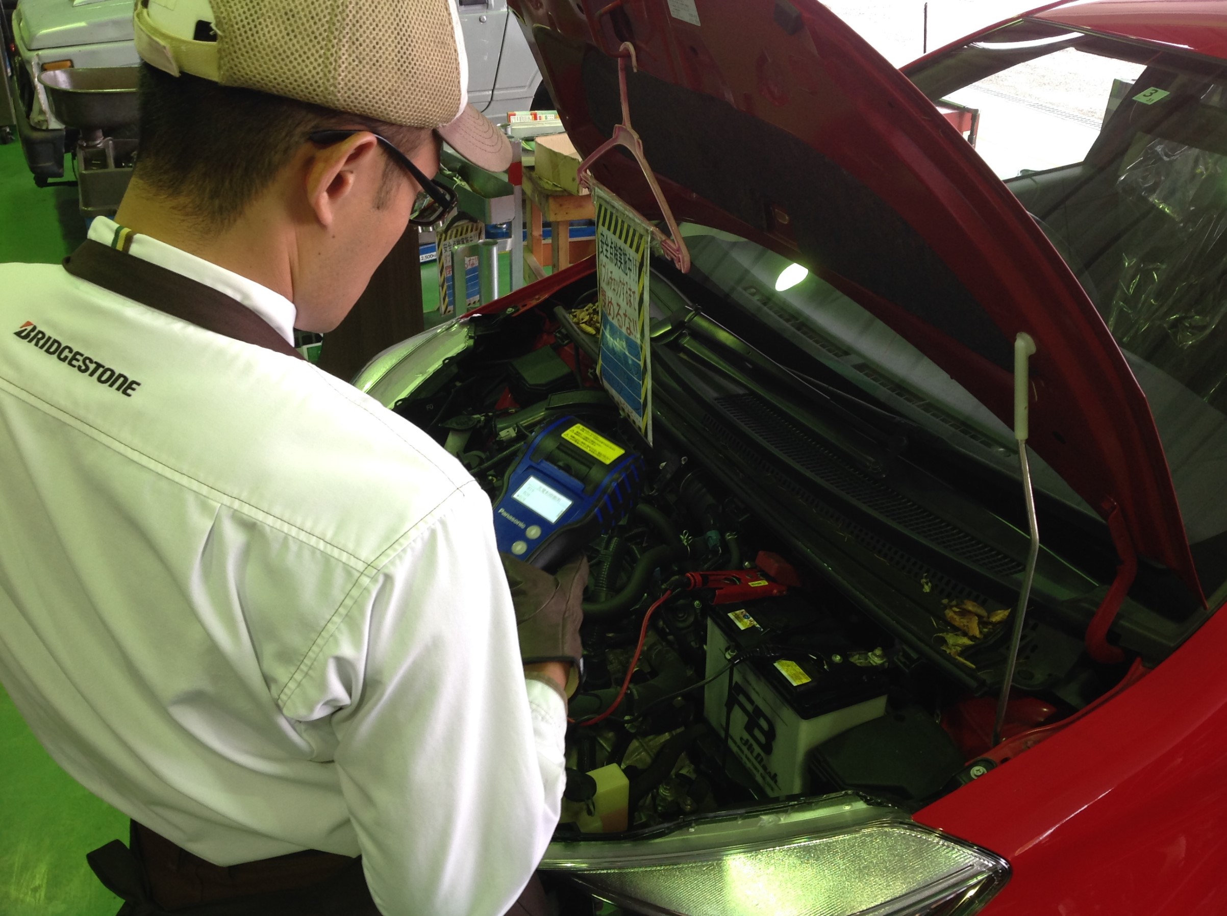 ↓ ヴィッツのバッテリー点検中の天野スタッフ
