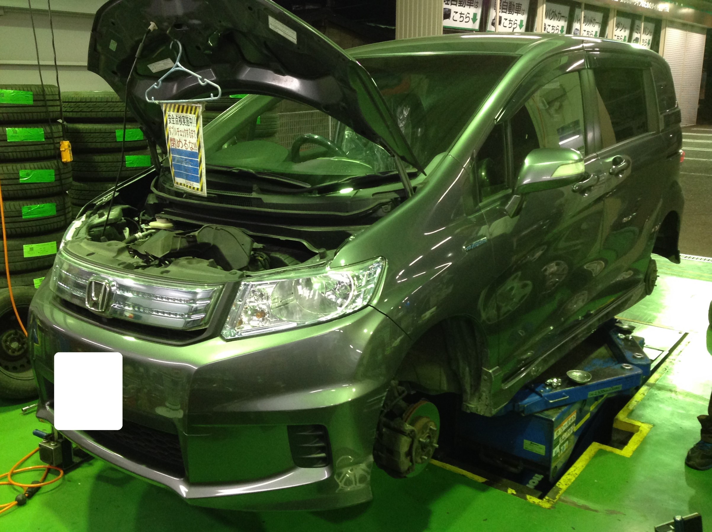 ↓ オイル交換を終えタイヤ取り付け待ちのフリード。