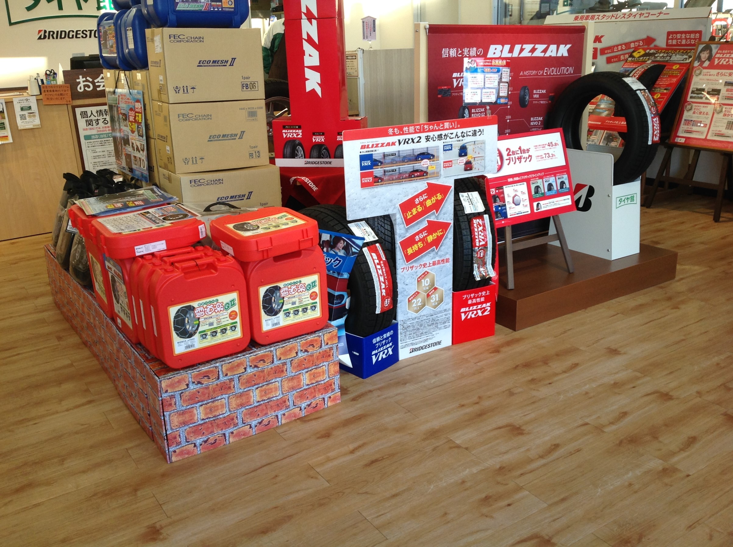 新年にも入り、いよいよ店内の配置換えを行いました!!お店に入っていただいてちょうど正面の所に冬タイヤ・チェーンをご用意しております★