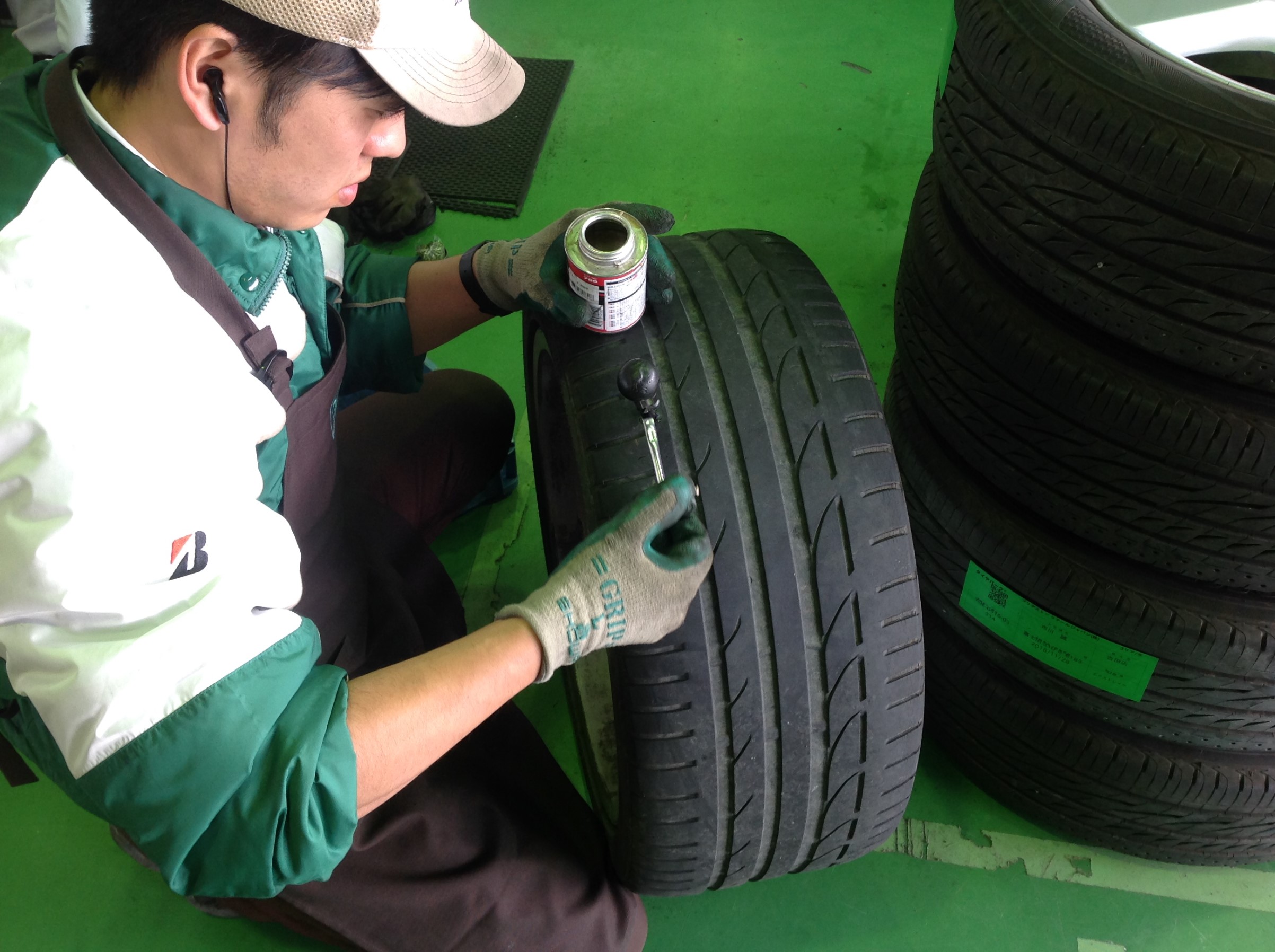 パンク修理でのご来店という事で三井主任がパンクを直している所をパシャリ。