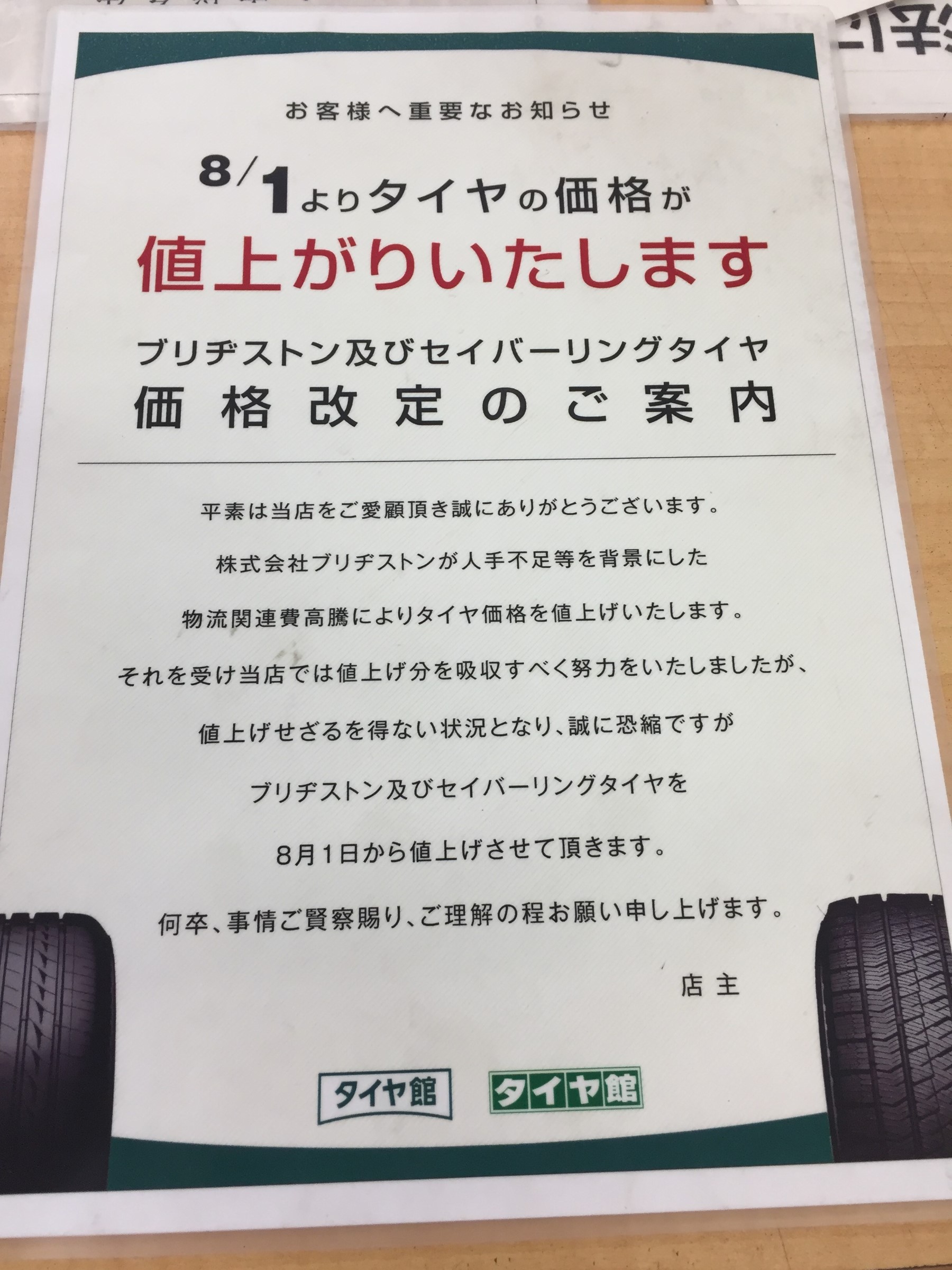 8月よりタイヤの価格改定(値上げ)が予定されています。