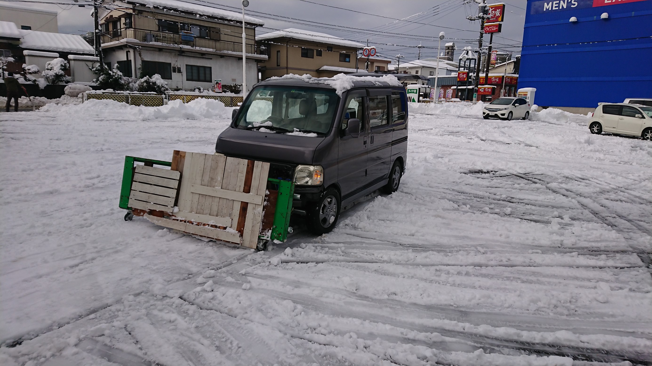 中村店長が朝早く出勤し、タイヤ館吉田お手製除雪機(?)で除雪をし