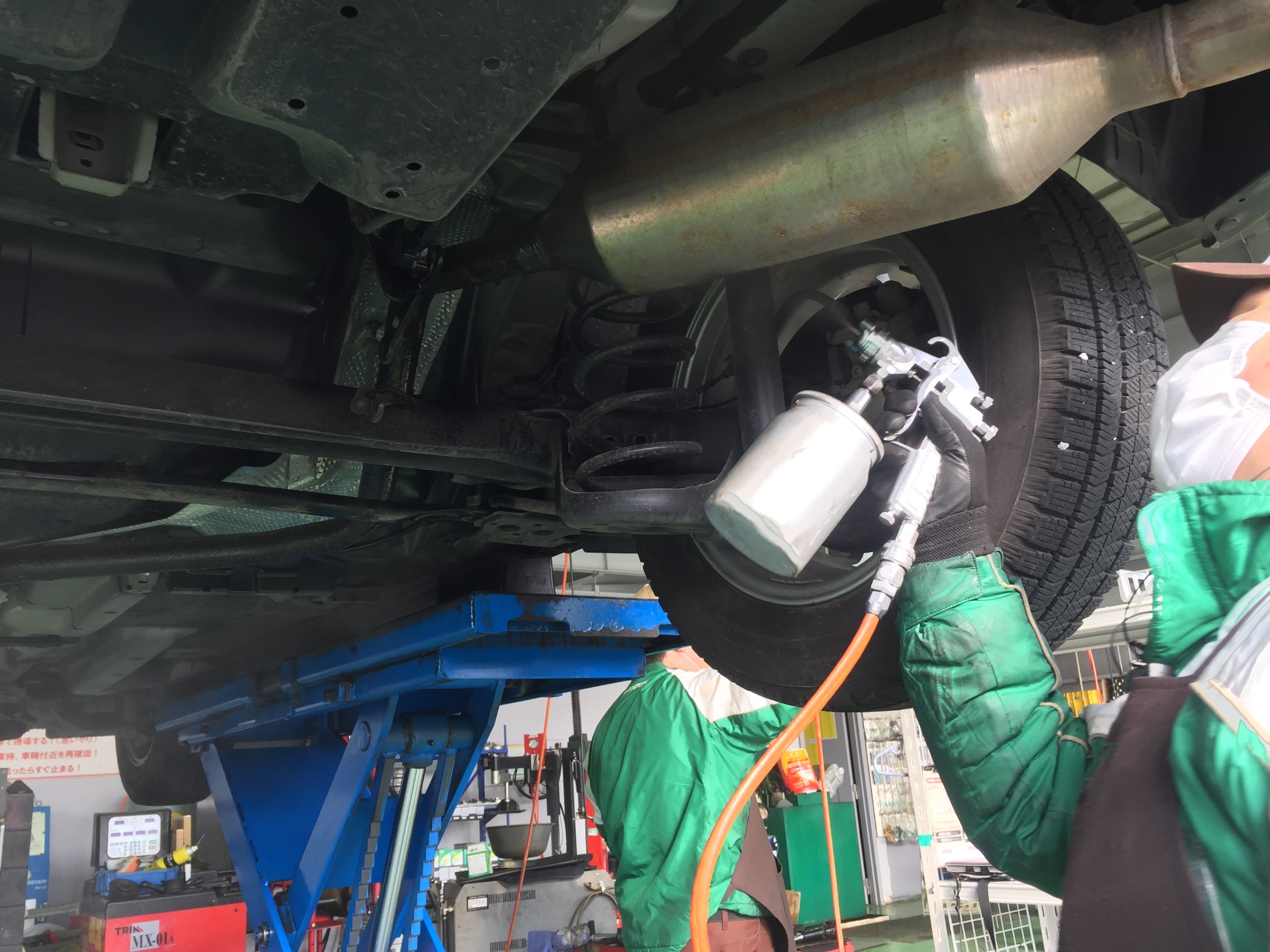 ↓ 今回はオイルとオイルフィルター交換。そしてマフラーの防錆コーティングを行いました。