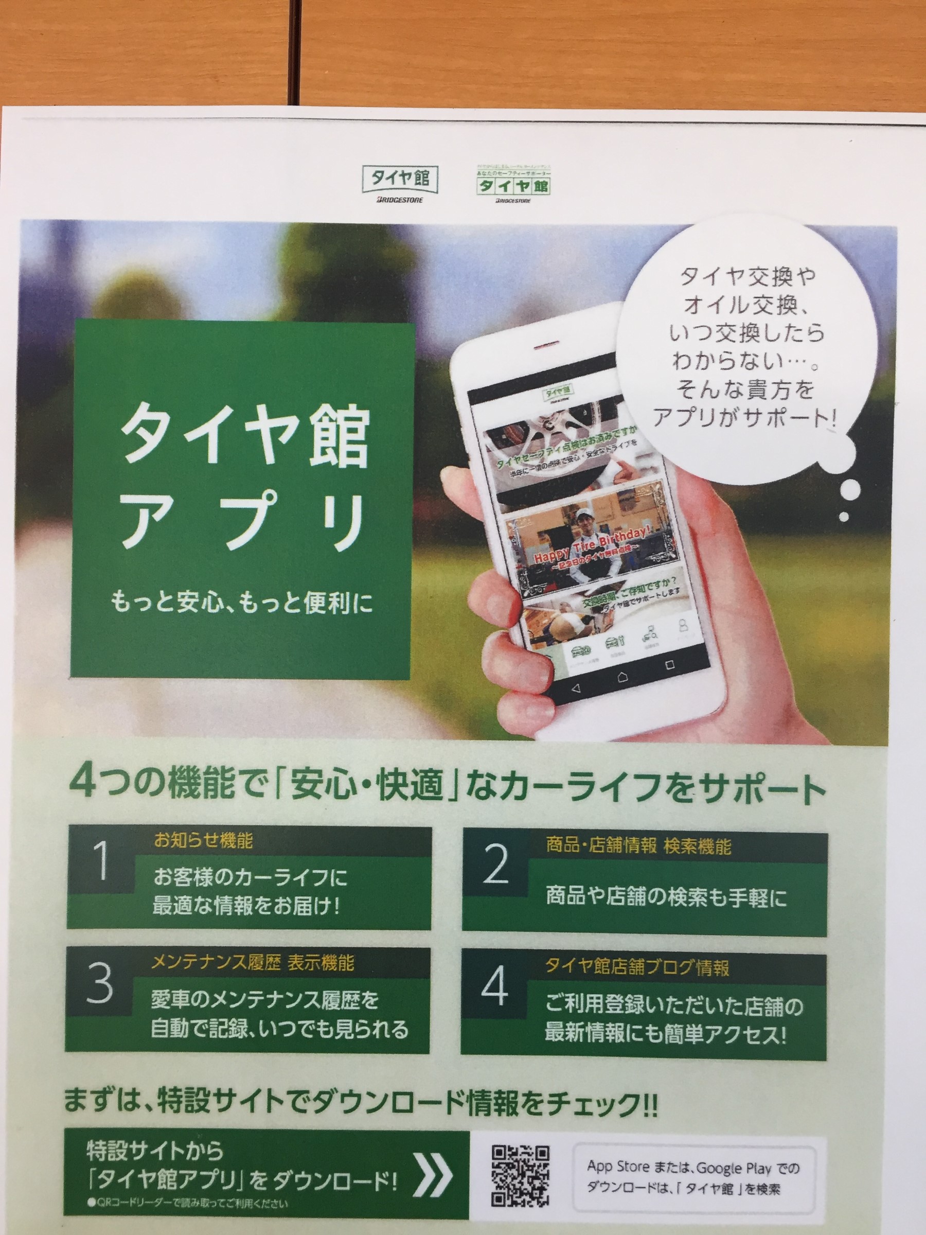 ところで皆さん、タイヤ館にアプリがあるってご存知でしたでしょうか!?なんとメンテナンスの履歴・お知らせなどをしてくれる優れものなんです(*´ω`)