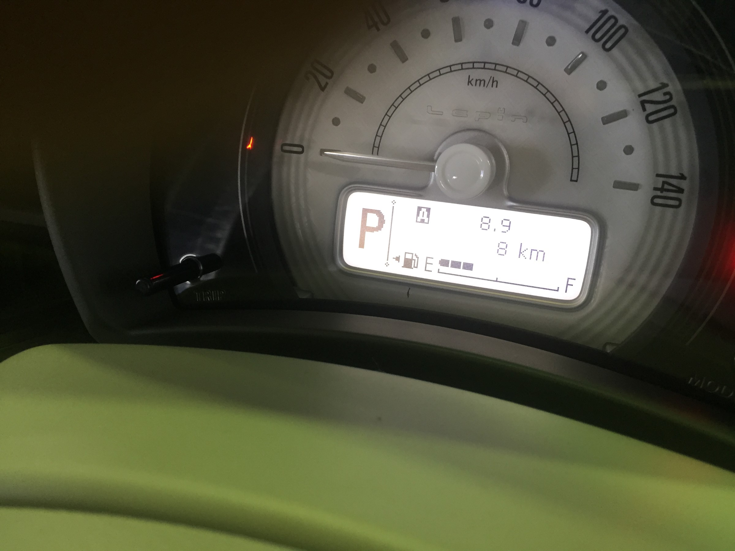 さて、こちらの紺色のオシャレなラパン、ディ―ラー様から納車されて直行で当店にいらしていただいたようで、なんとオドメーターの距離が・・・