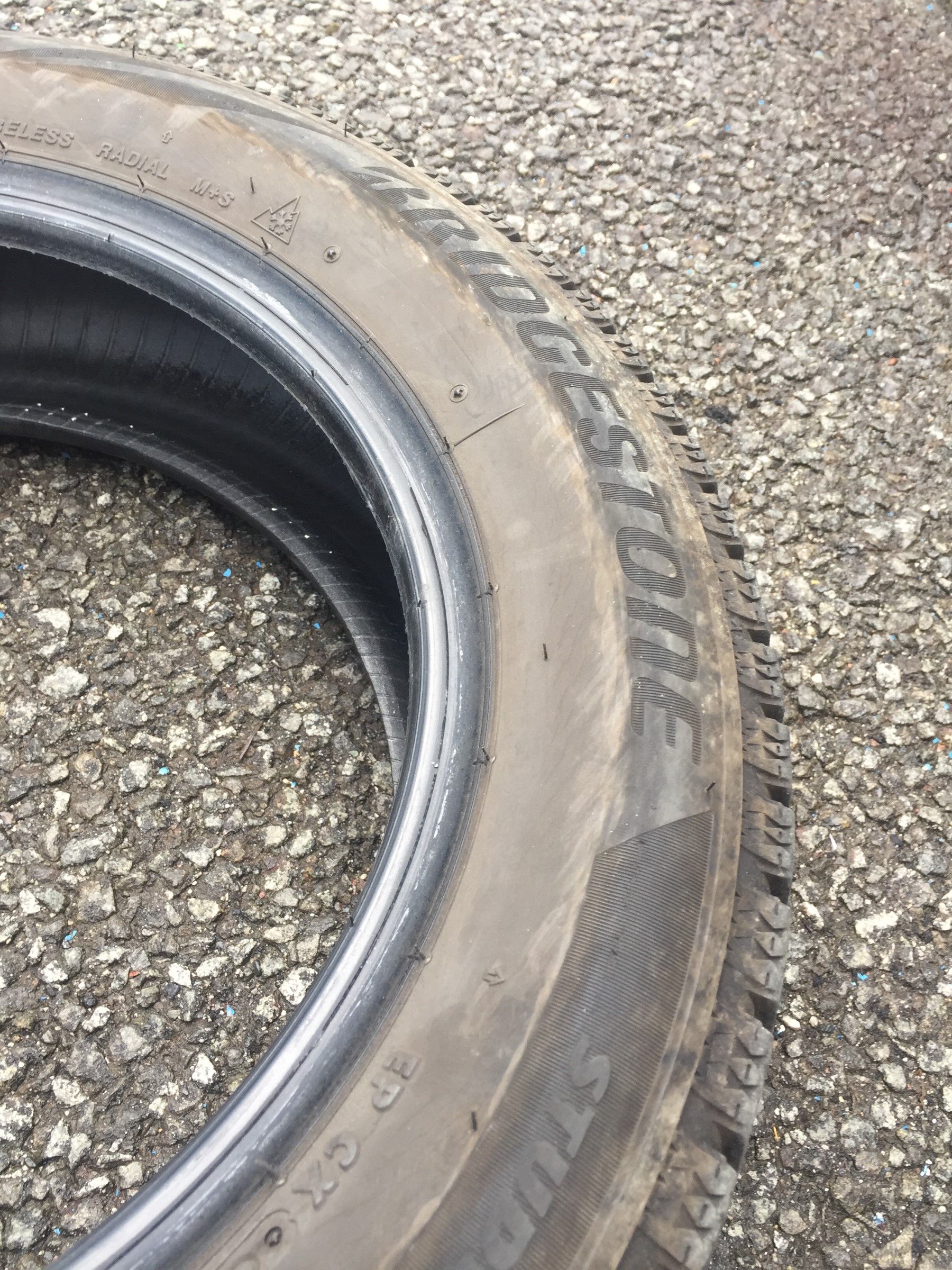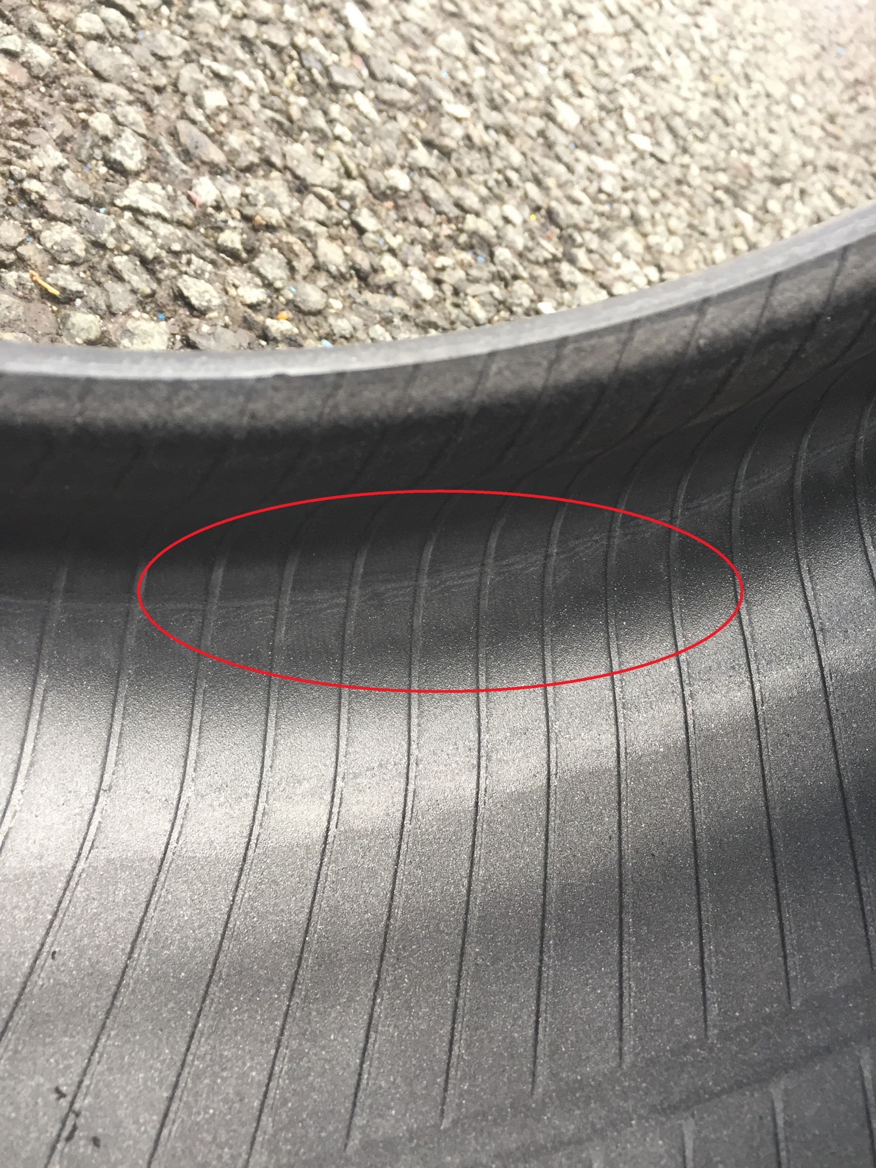 ↓ タイヤの内側を覗いてみるとゴムにしわが寄ってますね。強度が落ちてとても危険な状態です!
