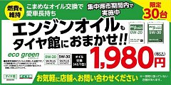 タイヤ館吉田店では本日4/9から4/30までエンジンオイル交換セール開催中です。 30台限定でスノコオイル製のエコグリーン 0W20と5W30(4L缶)を提供致します。 幅広い国産車に対応致しますのでこの機会にオイル交換は如何でしょうか?