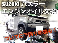 本日ご紹介する作業はSUZUKI ハスラーのエンジンオイル交換です! ↓ 一緒に下回り全体防錆も行いました!塩カルが沢山撒かれるシーズンなので大事ですね。^^ ↓ 最後に新しいエンジンオイルを入れて作業完了です! ↑ 奥に止まっているbBもそうなのですが、ボディコーティングがとても公表で沢山の...