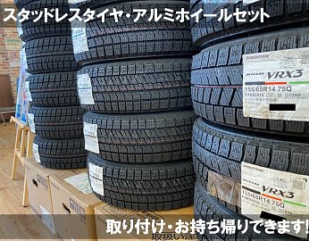 スタッドレスタイヤの組み込み品をご用意いたしました!! サイズは155/65R14 軽自動車用で VRX3、VRX2、アイスパートナー2 の3種類です!! アルミホイールに組み込みしバランスの調整も済んでいるので すぐにでもお取り付け・お持ち帰りができます!! 最近の軽自動車は車種によってホイールの内側に貼...