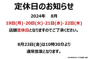 8月は水曜日と19日(月)~22日(木)の4日間が店舗定休日となりますのでご了承ください。