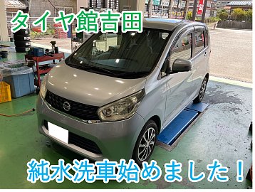純水洗車はじめました!! いつもタイヤ館吉田店のHPをご覧いただきありがとうございます! 本日は、新サービス「純水洗車」「車内清掃」をご紹介いたします! 通常、水道水には「残留塩素」や「ミネラル」が混ざっており、ウォータースポットや拭き跡が残り、お車をきれいにするのに邪魔になってし...