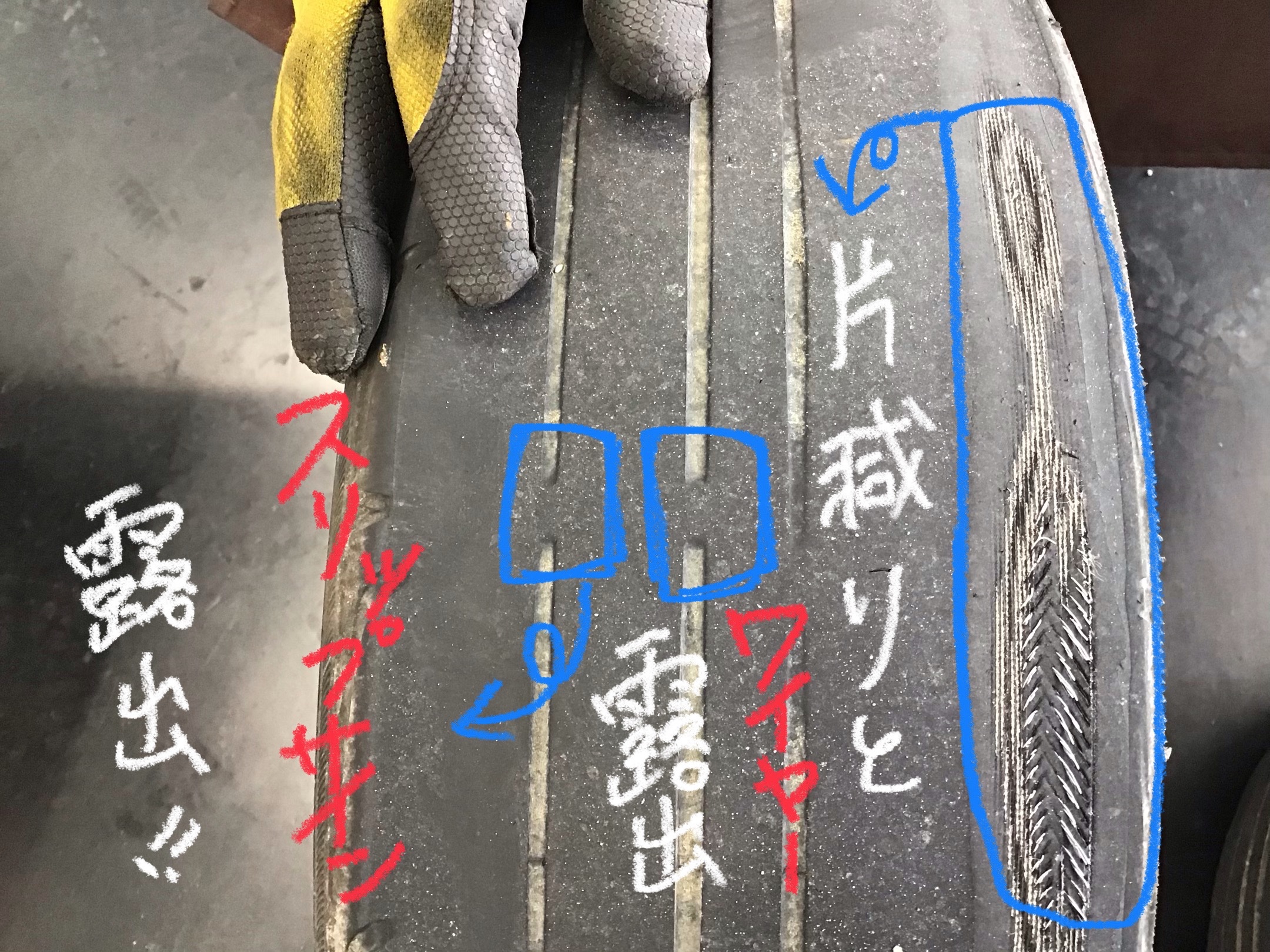▼さらに、タイヤの使用限度の「スリップサイン」が露出してしまってますね!