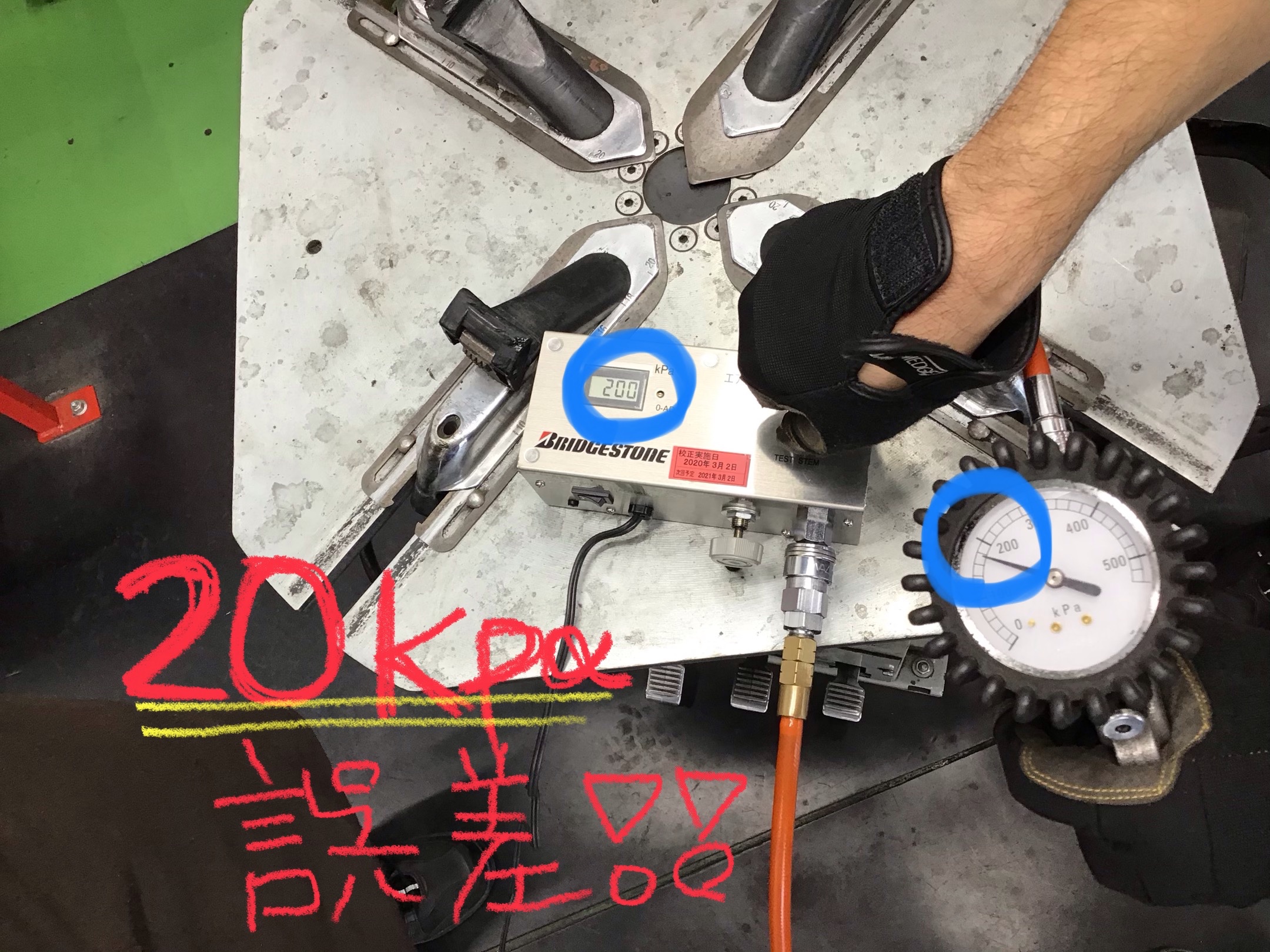 《200kPa》で設定し測定すると《180kPa》と《20kPa》少ないようなので補充時には